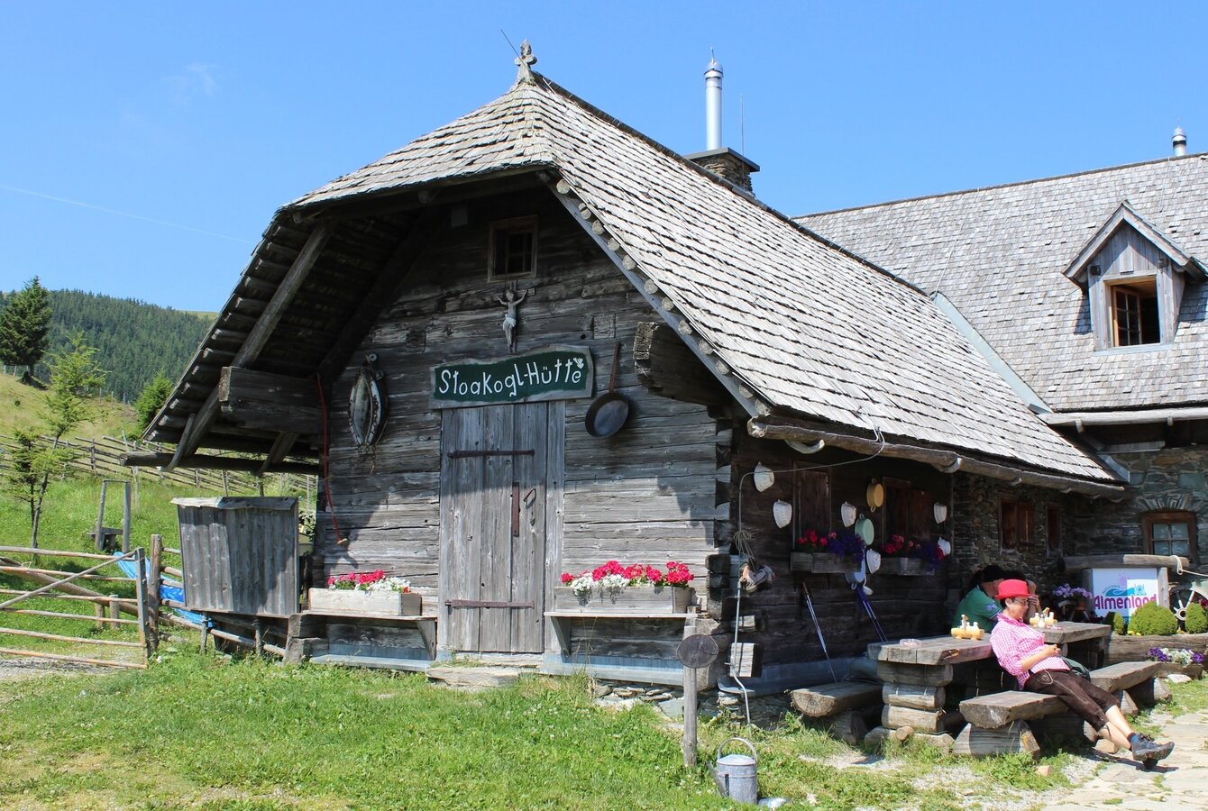 Nach dem Abstieg vom Plankogel, wartet mitten auf der Sommeralm die gemütliche "Stoakoglhütte" mit vielen Schmankerln auf Gäste.