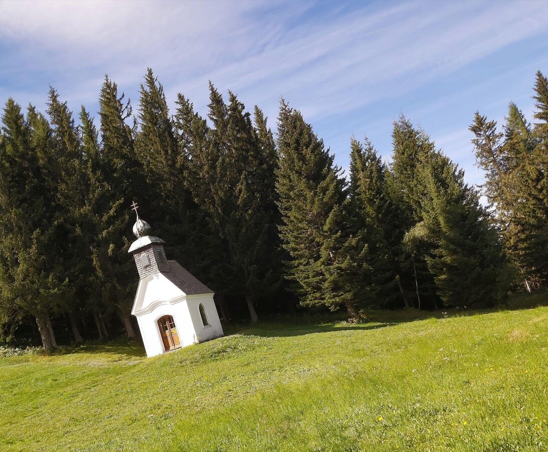 - Angekommen bei den Wetterkreuzen halten wir uns links und gehen den Wirtschafts-Weg-Nr. 745/706 hinaus bis zur Sommeralm-Kapelle.
