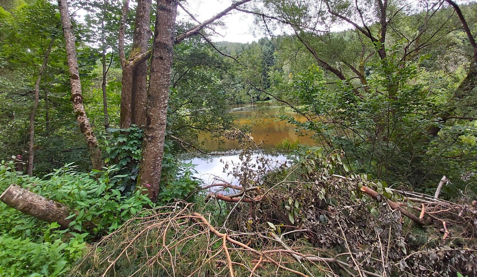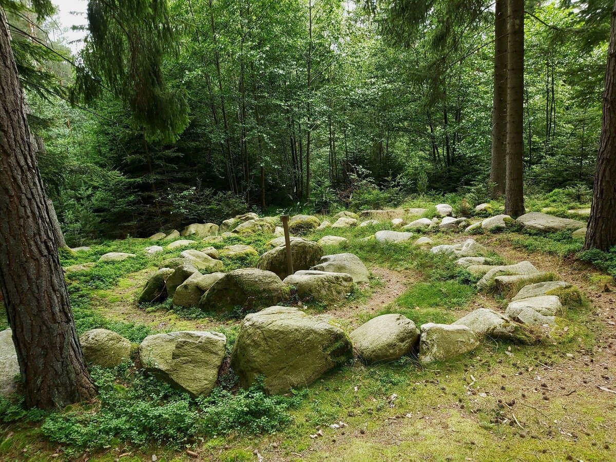 - Wir kommen zum Steinlabyrinth, gehen ein Stück zurück und dann rechts hinaus aus dem Wald. Der idyllische Teich samt Rast- und Grillplatz bietet sich für eine Pause an.