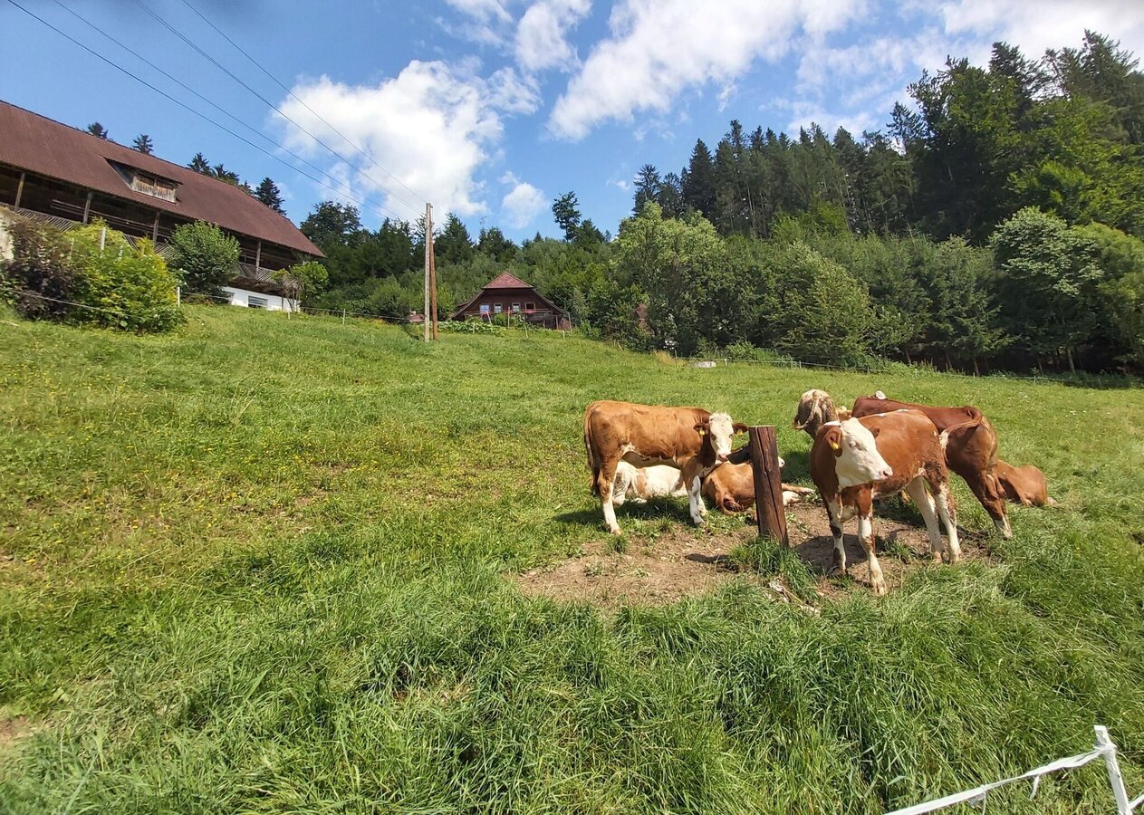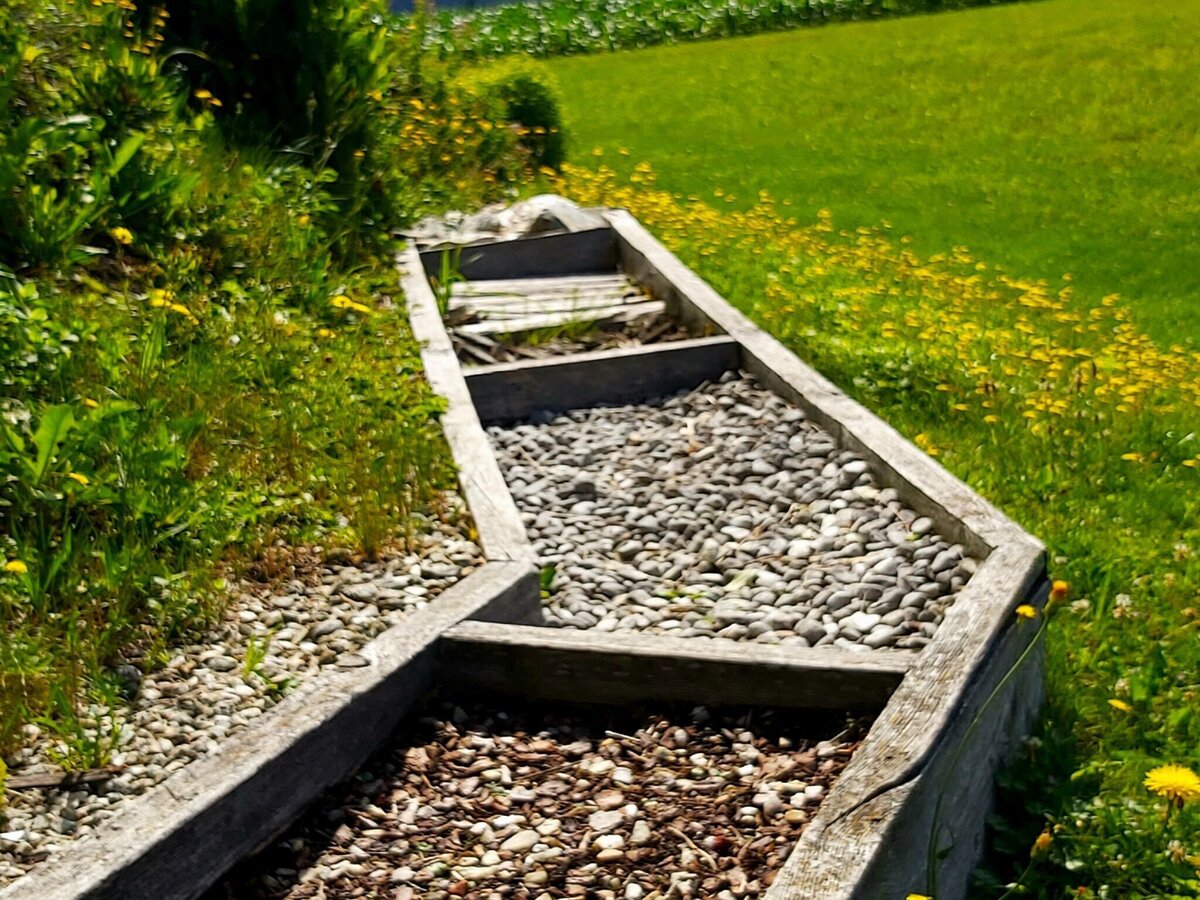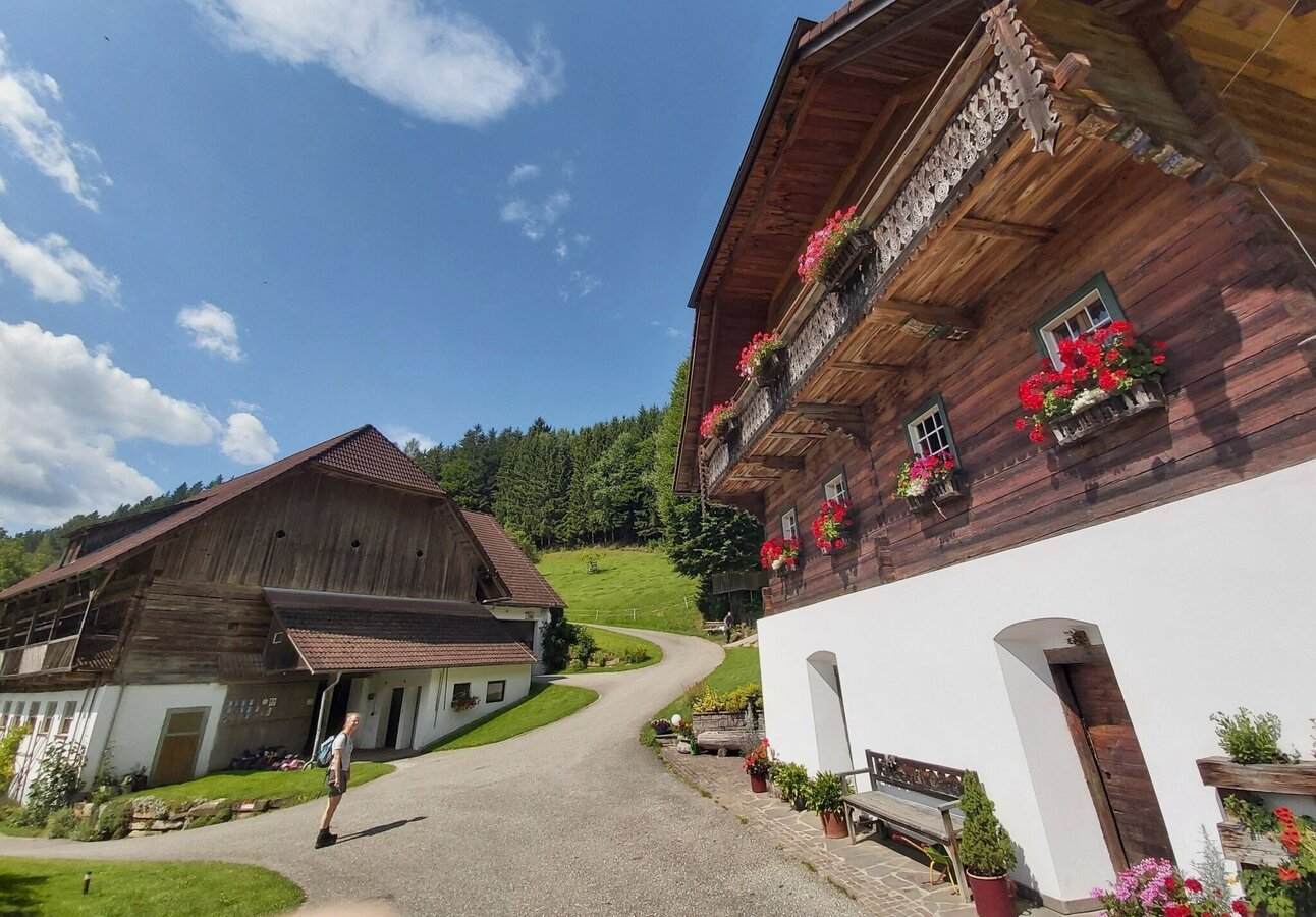 - Nach dem Seillabyrinth halten wir uns rechts und gehen durch das wunderschöne Gehöft Fahrnleitner mit Garten, unser Weg führt links vorbei am Stallgebäude.