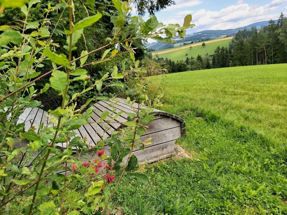 - Bevor wir in den „Schlagwald“ gehen, lädt uns noch die Meditationsliege zu einer Rast mit Aussicht ein.