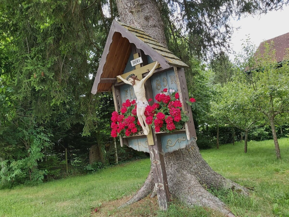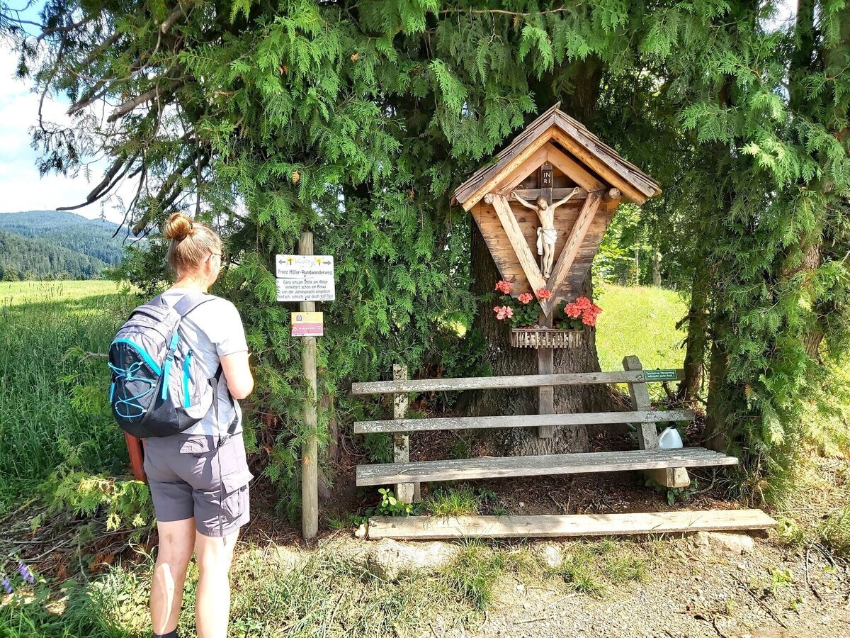 - Vorbei an der Friedenskapelle gehen wir hinunter bis zur Straße, dort gehen wir links weiter und kommen bald an einem Wegkreuz vorbei.
