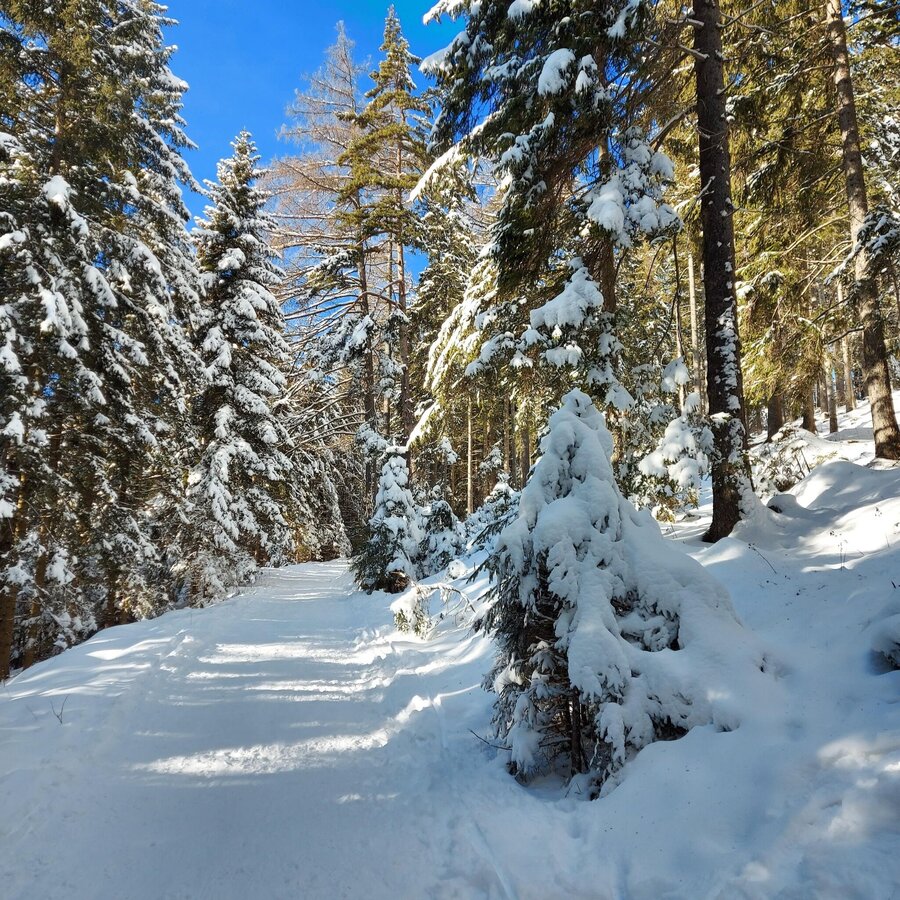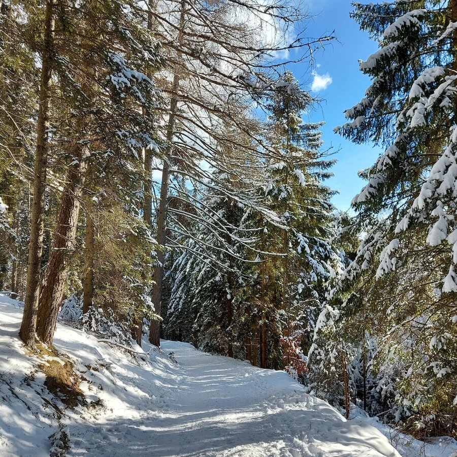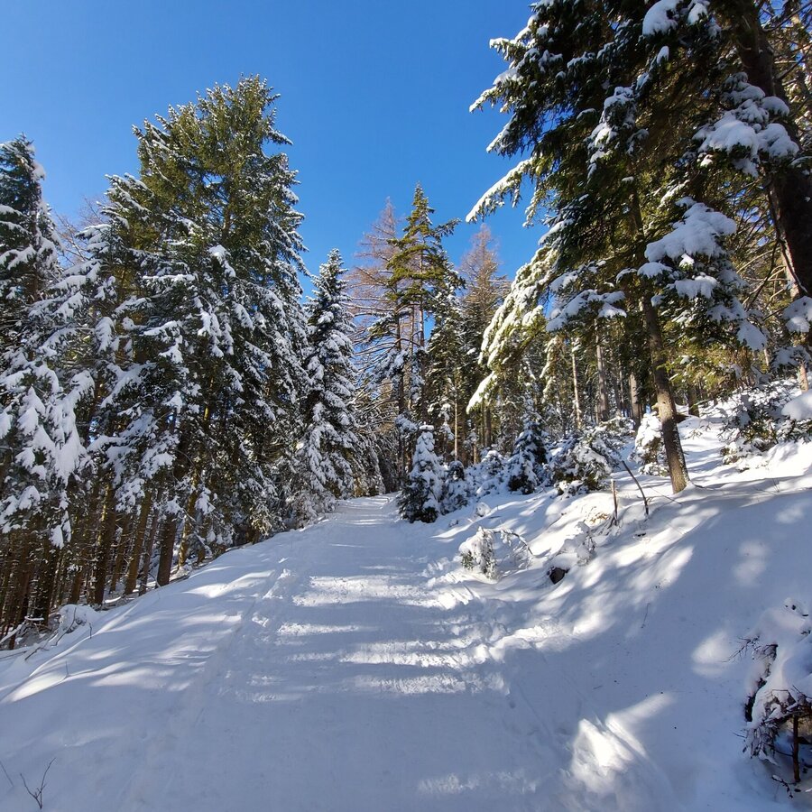 - Zuerst folgen wir der Straße bis wir die Vogelhütte erreichen. Von dort an wandern wir den Waldweg entlang bis zur ersten Kreuzung. Hier halten wir uns links und folgen dem Weg etwas steiler hinauf auf den Patscha.