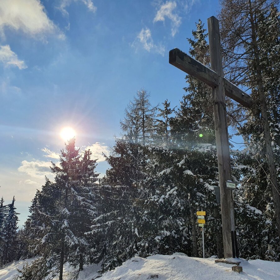 - Wir folgen dem Pfad immer weiter hinauf. Nach einem etwas steileren Stück kommen wir wieder zu einer Abzweigung und halten uns hier links und folgem dem Pfad hinauf bis zum Gipfelkreuz.