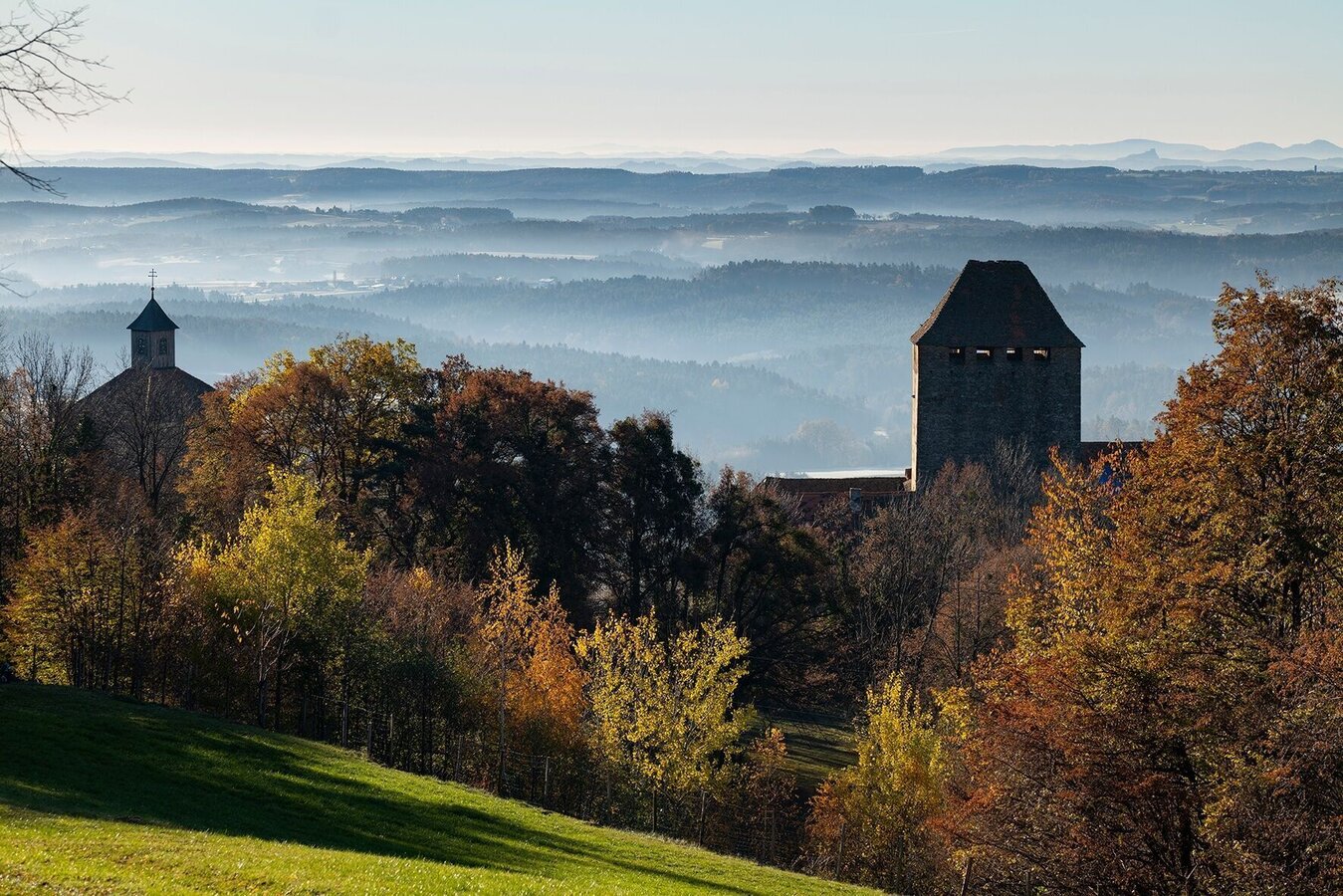 • von hier aus den Hinweisen folgend zum Römischen Gutshof. Flurwege leiten sonnseitig bergan zu jener Straße, auf welcher man die Burg Neuberg erreicht,