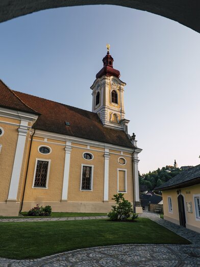Die Bau- und Kunstgeschichte der Wallfartskirche Maria Hasel. Die verschiedenen Bauphasen der Kirchen erfahren Sie bei dieser Station.