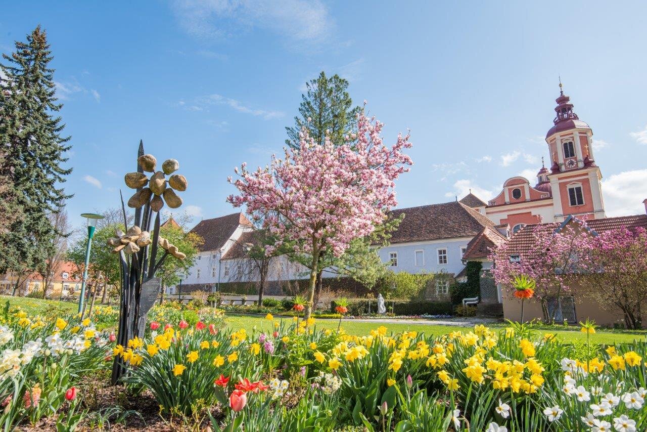 Auf den letzten Metern bis zum wunderschönen Marktplatz mit dem beeindruckenden Schloss Pöllau, das aufgrund seiner Form auch der "Steirische Petersdom" genannt wird, kommen wir noch in den Schlosspark, der früher Erholungsraum der Augustiner Chorherren war und heute für alle geöffnet nicht nur zum Verweilen einlädt, sondern auch ein "Freiluft-Klassenzimmer" beheimatet. Dieser im westlichen, leicht erhöhten Teil des Parks gelegene Platz bietet einen herrlichen Ausblick auf das Schloss Pöllau mit der Pfarrkirche Pöllau und die Wallfahrtskirche Pöllauberg. Ein Wurzelschaugarten gleich anschließend bietet einen tiefen Einblick in Wurzelwerk und Bodenleben. Bei der Hirschbirn hirsch´n Infostation erfahren wir mehr über die Pöllauer Hirschbirne und den Naturpark – einen Besuch wert sind auch die weiteren Hirschbirn hirsch´n Stationen bei Betrieben der Region.