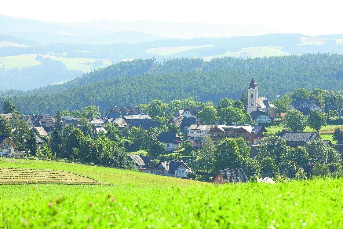 - Wir starten am Fischbacher Dorfplatz und spazieren entlang der Dorfstraße Richtung Norden leicht bergauf vorbei am Museum für bäuerliches Handwerk bis wir nach Veronikas Kräuterhof (auf der rechten Straßenseite) links abbiegen und uns jetzt auf dem Weg Nr. 9 befinden