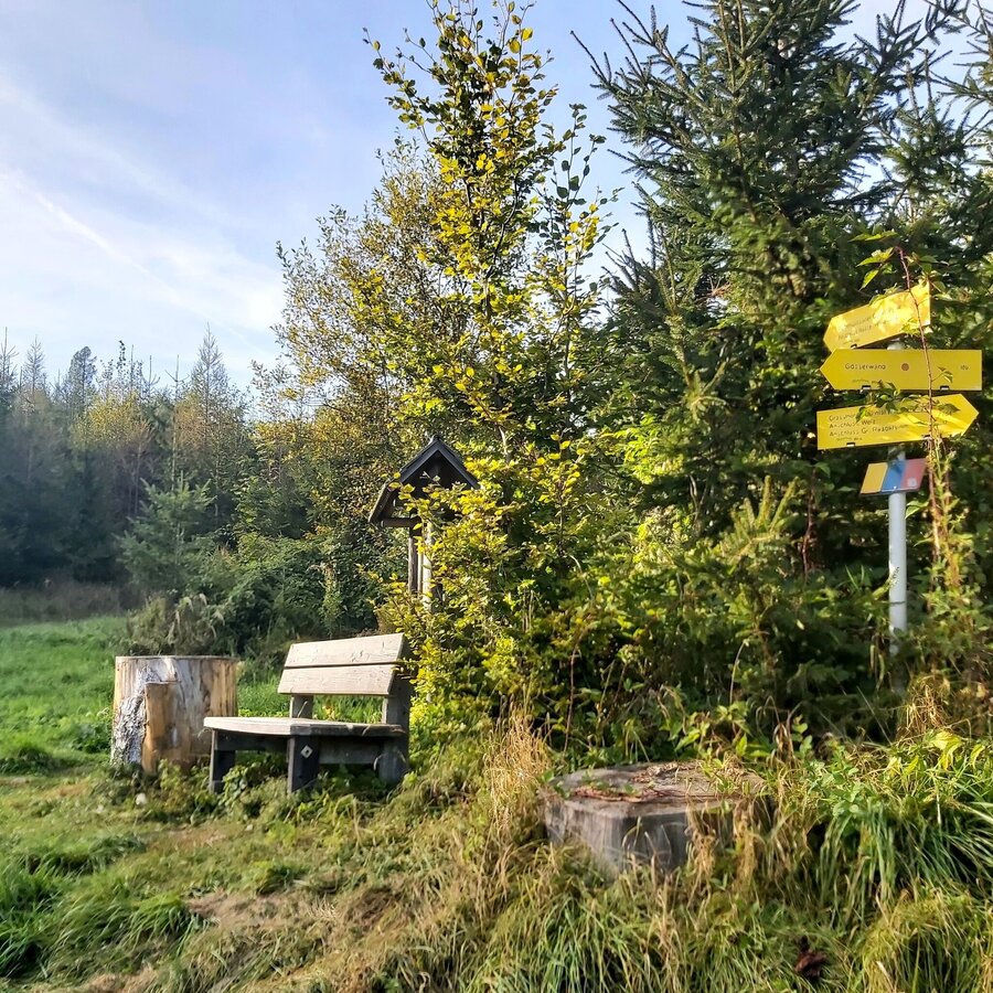 - Rechts kommen wir gleich an der kleinen, gelben Wegkapelle am Wachthaussattel vorbei, die Bankerl dort laden zu einer Rast ein.