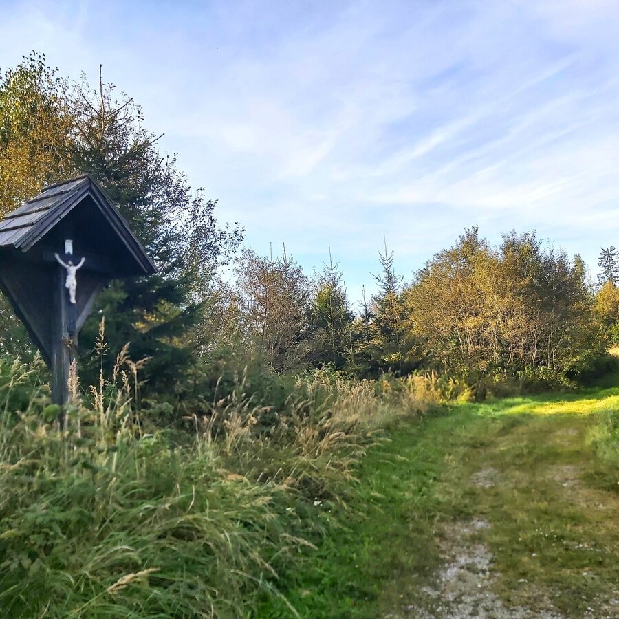 - Beim Anerlbauerkreuz kommen wir wieder zurück auf den Weg-Nr. 18 und gehen diesen links hinaus weiter in Richtung „Lärchsattel/Wachthaussattel“.