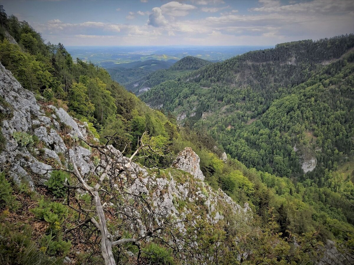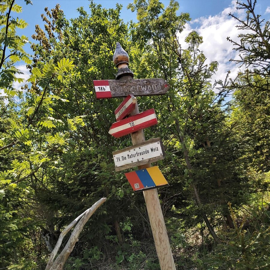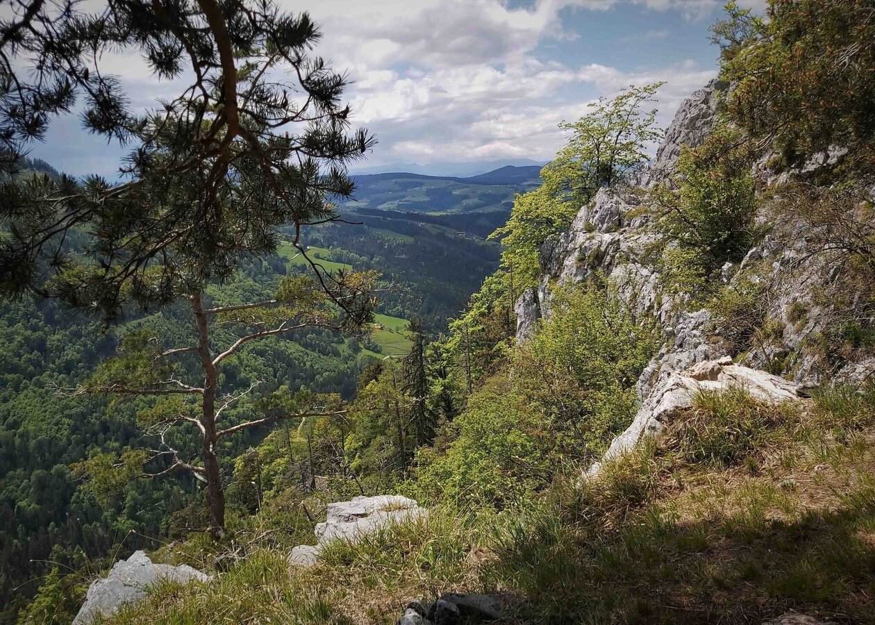 - Wir biegen hier links in das sogen. „Gösserringerl“ bzw. in den Gösserwandsteig ein (Weg-Nr. 18b) und umwandern am Steig den Gösser. Von der Gösserwand oberhalb der Raabklamm haben wir fantastische Ausblicke.