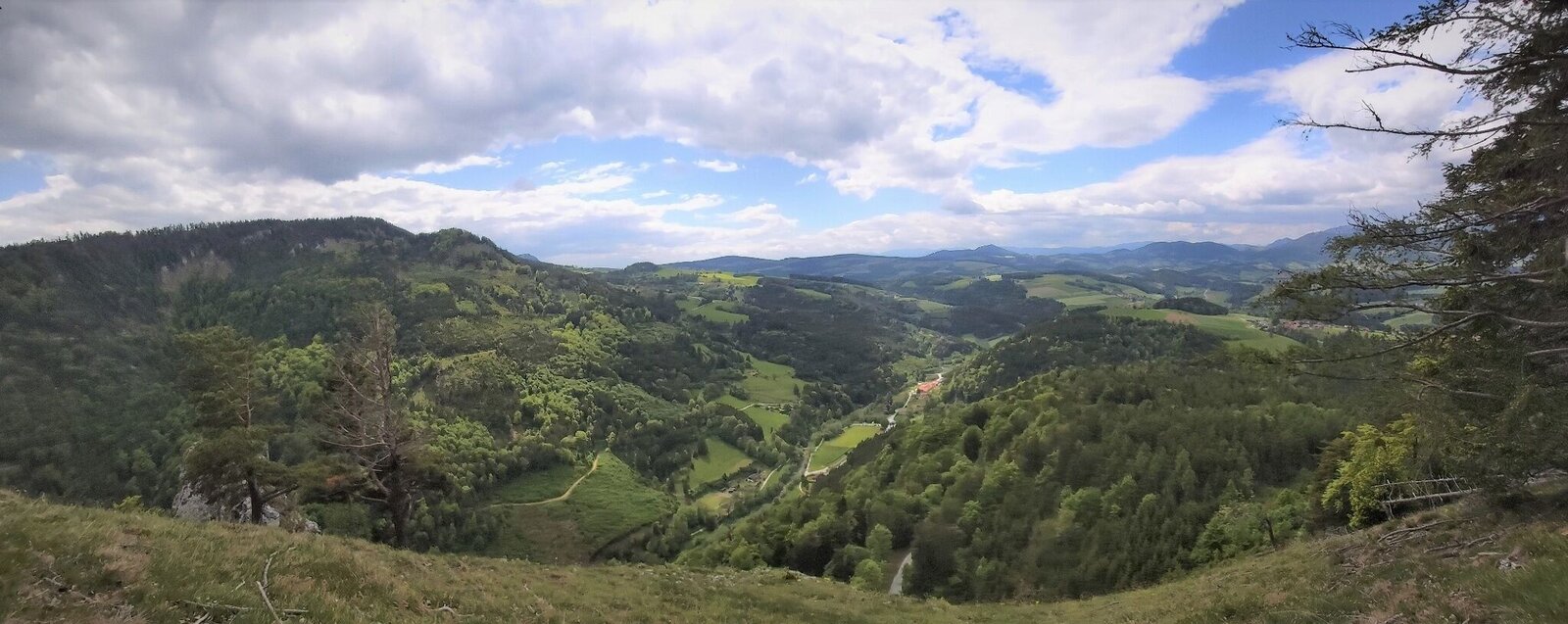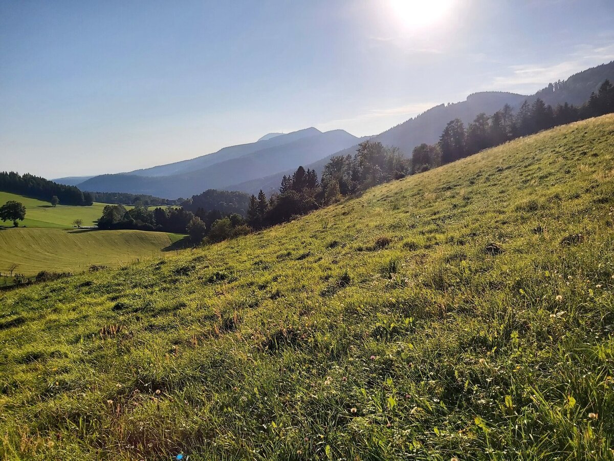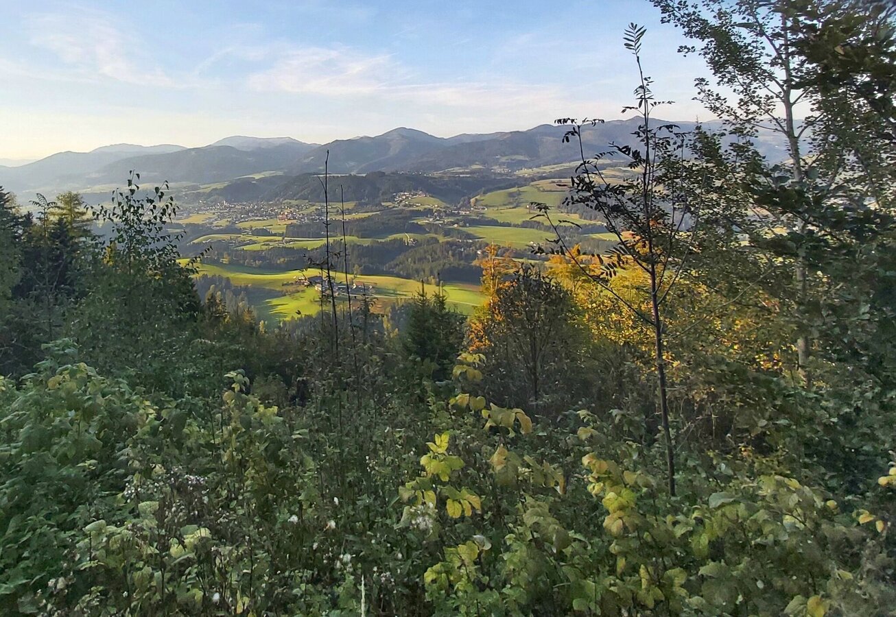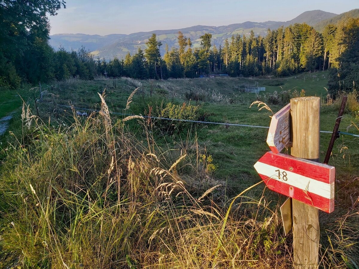- Wieder zurück am Wanderweg schauen wird rechts über die Weide hinaus auf den Lärchsattel bzw. hinunter nach Weiz und gehen weiter am Weg-Nr. 18 in Richtung „Wachthaussattel/Gschaid“.