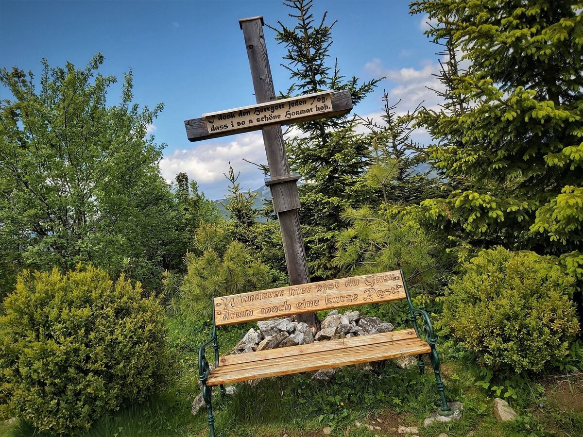 - Wir kommen gleich vorbei am Sattelwegkreuz mit Inschrift und Bankerl, dort können wir links ein paar Schritte hinausgehen und haben dann einen fantastischen Ausblick in den Passailer Kessel und auf das Teichalm-/Sommeralmgebiet.