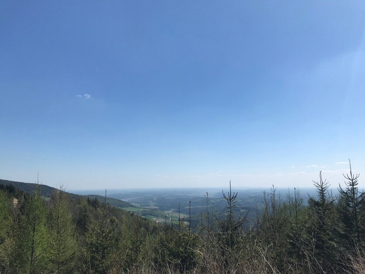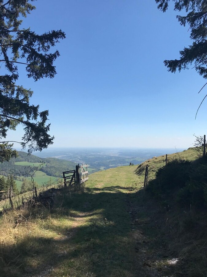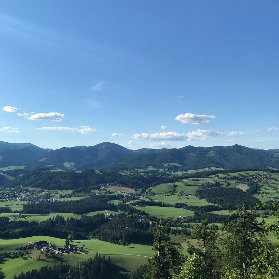 - Zurück am Forstweg machen wir noch einen kurzen Halt auf der Weidewiese mit einem wunderschönen Ausblick auf Weiz.