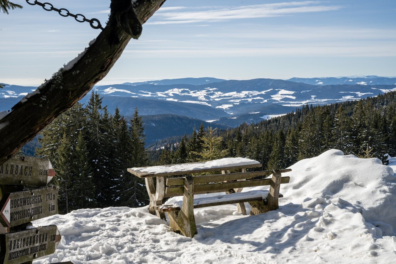 - Auf der präparierten Naturrodelbahn gehen wir bis zu einer Wegkreuzung, an der werden wir von einer Skulptur aus Wegweisern empfangen