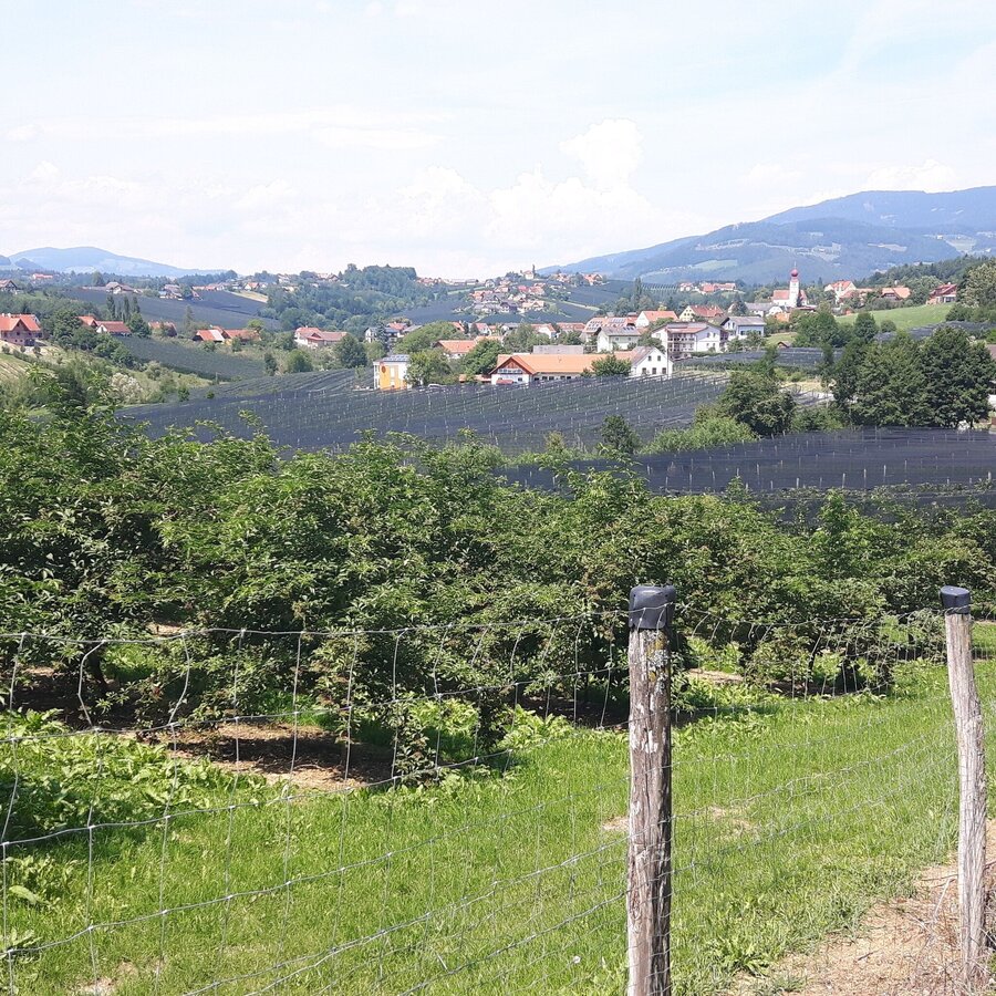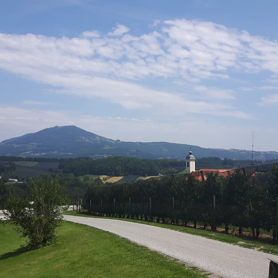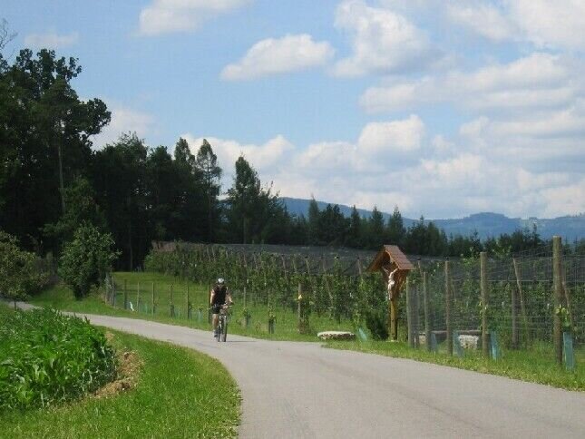 - Nach wenigen hundert Metern zweigt der WZ4 auf den Sandriegelweg ab, der alsbald in den Hohenbergweg einmündet. Nach ein paar kurzen Serpentinen gelangen wir an eine Kreuzung, wo wir links auf den WZ10 abzweigen. Diesem nun folgend fahren wir abschnittsweise entlang der Oststeirischen Römerweinstraße und der Steirischen Apfelstraße. Der Wein und der Apfel sind auch landschaftlich unsere Wegbegleiter auf dieser Tour entlang des Höhenrückens auf dem wir uns nun befinden.