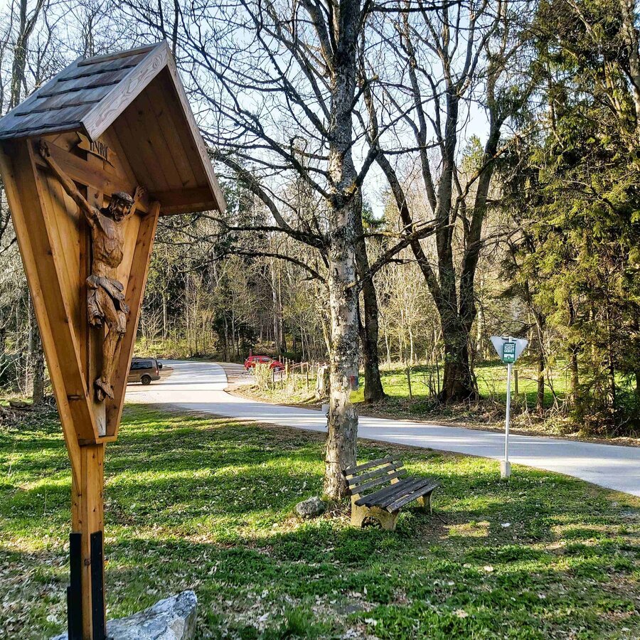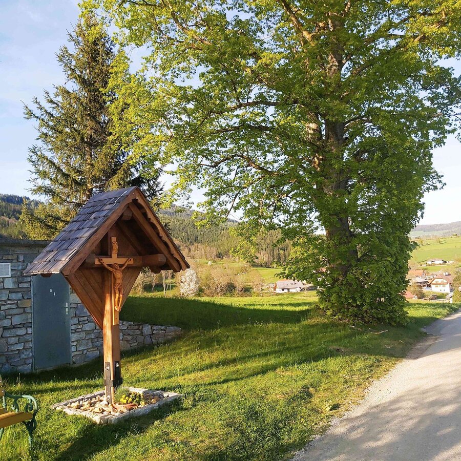 - Wieder an der Kreuzung mit der Semriacherstraße, biegen wir rechts ab und fahren hinauf bis in den Ortsteil Anger. Hier wartet beim Angerwirt (leider geschlossen) ein schöner Rastplatz beim Wegkreuz.