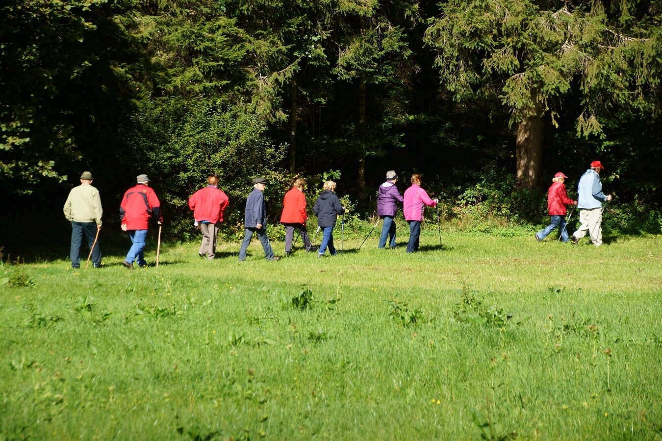 Wir gehen vorbei an einem Bauernhof und weiter durch Wald und Wiesenrand
