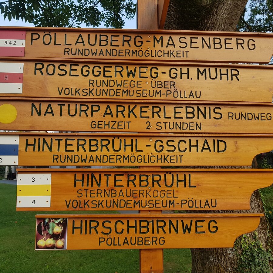 Die Wanderung startet im Schloßpark Pöllau und führt über den Aupark, durch die Hinterbrühl zum NaturKRAFTpark. Nach dem Sie sich eine kleine Stärkung im Hotel Restaurant Gruber gegönnt haben, setzen Sie den Weg fort, biegen bei Allmer vulgo „Toni auf der Wiesn“ links ab und gelangen zum Gasthaus Derler. Nun beginnen Sie den Anstieg zum Rabenwaldkogel, 1280m, dem höchsten Punkt im Naturpark Pöllauer Tal. Sie setzen den Weg unter dem Talkbergbau am Rabenwald fort, passieren das Schwaigkreuz und haben am Sender das Ziel erreicht und können mit SAM zurückfahren. Alternativ können Sie vom Rabenwaldkogel zurück zu Gasthaus Derler gehen und dort mit SAM nach Pöllau fahren. Möchten Sie weiter die Runde nach Pöllau gehen, können Sie Ihren Rückweg entweder über den Wanderweg 922 oder länger nach dem Sender über den Weg 923 (ca. 2,5h) nehmen.