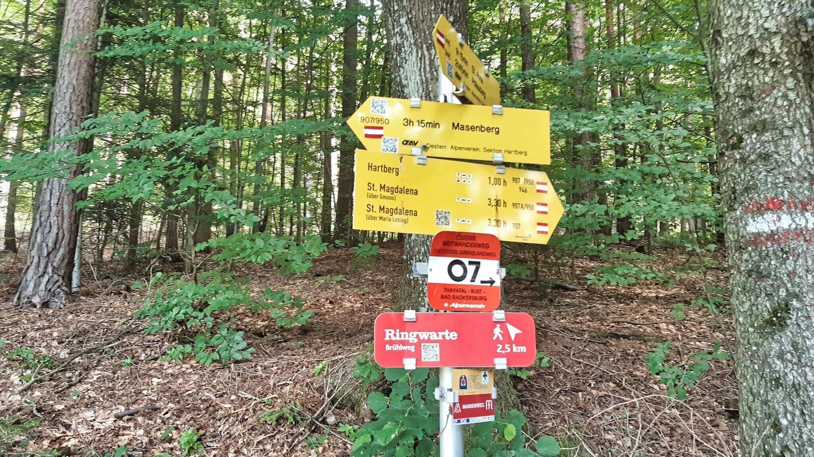 - Hier sehen wir die Wegweiser mit der Aufschrift „Ringwarte“ und gehen nach links.