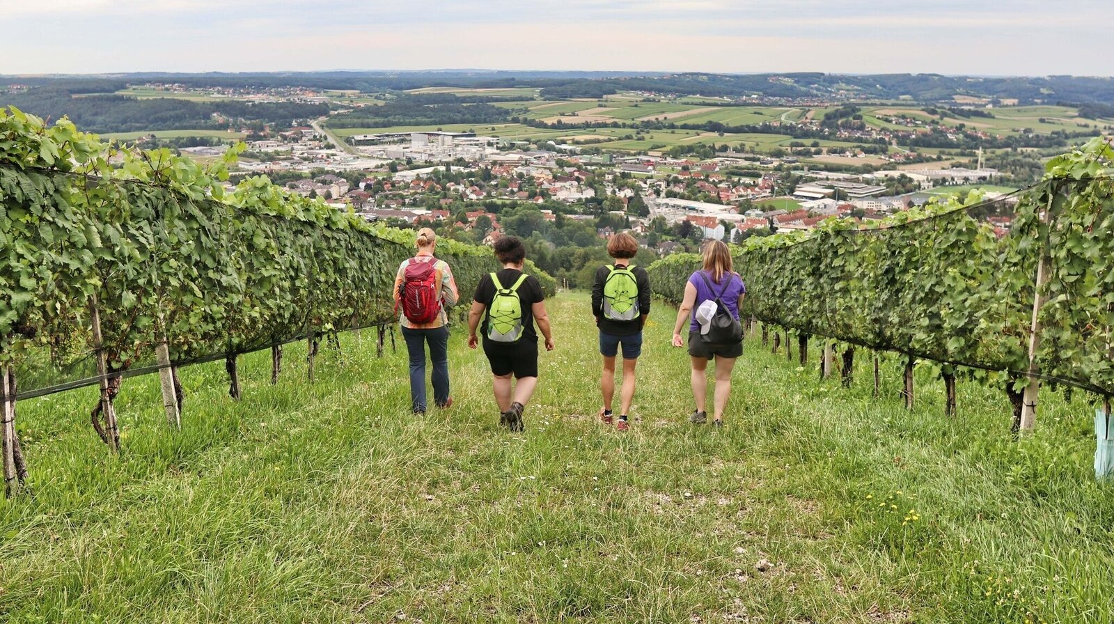- Beim Parkplatz sieht man den Einstieg in den Wanderweg, der nun direkt durch die Weingärten hinunterführt und durch die rot-weiß-roten Markierungen deutlich zu erkennen ist.