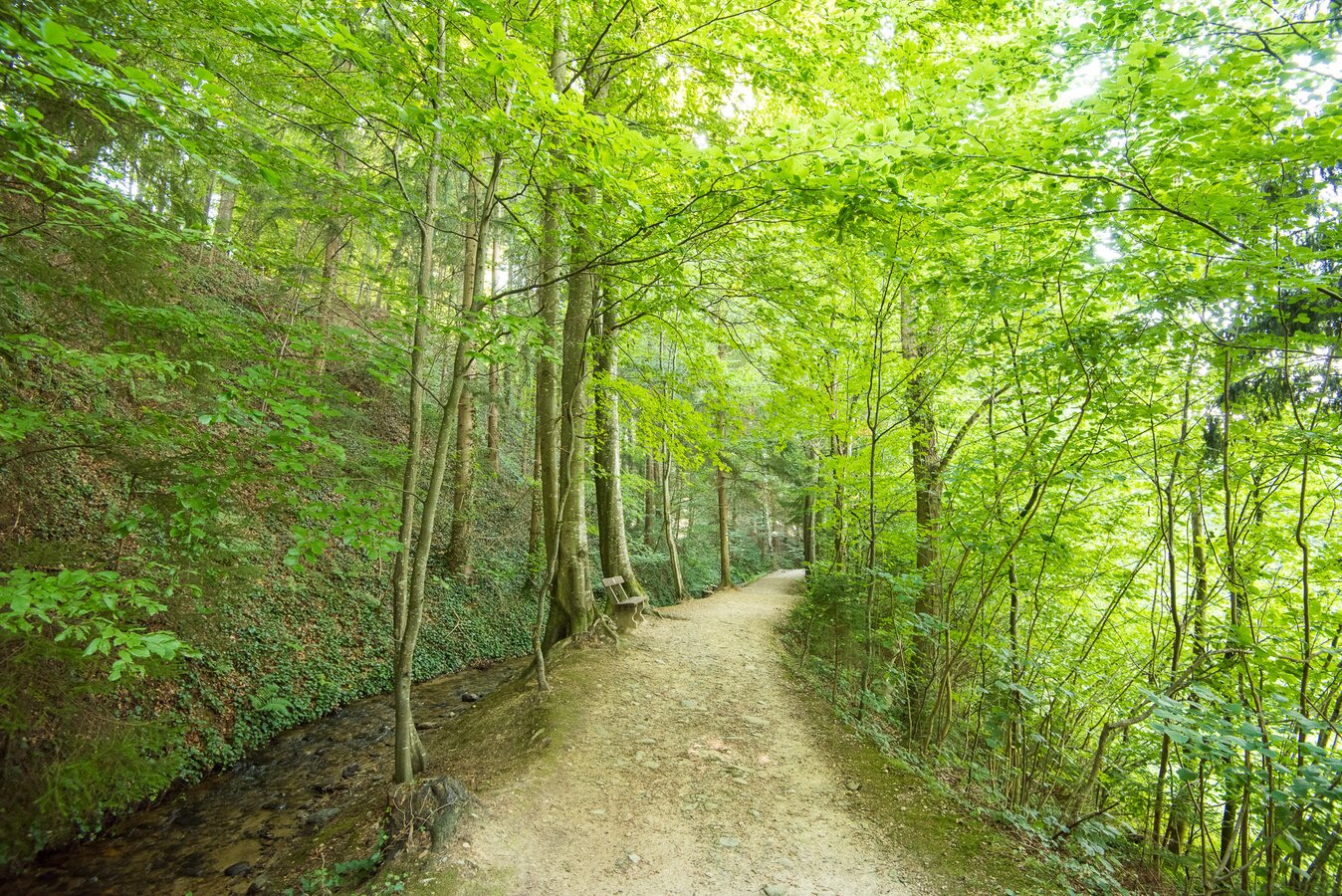- Entlang des Roseggerwegs (Wanderweg Nr. 5) sehen wir auf der anderen Bachseite die Ölmühle Fandler bevor wir an einer Wohnsiedlung und der Kunsttischlerei Hirt vorbeikommen und wieder zur Landesstraße L406 gelangen.