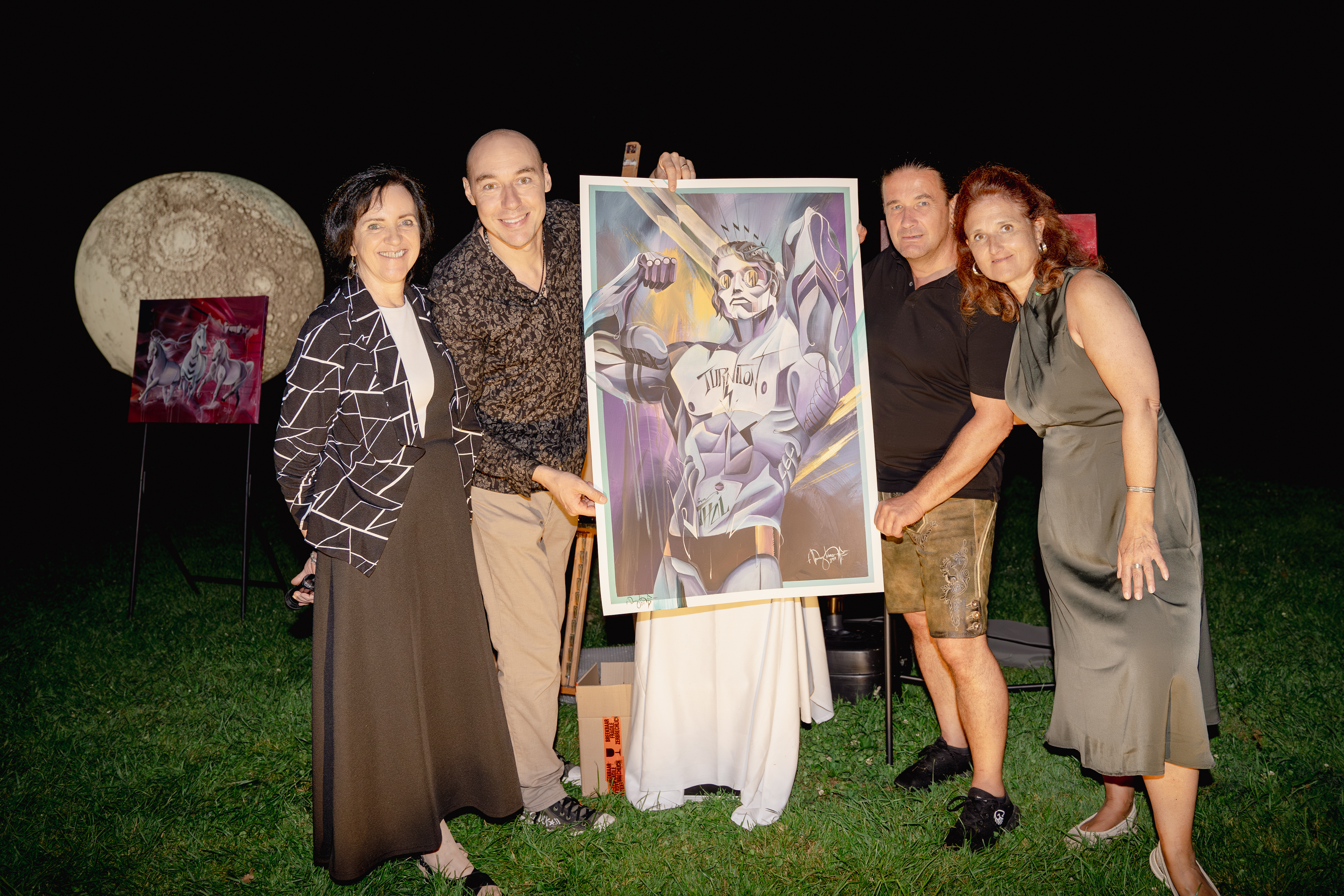 Anschließend ging es in einem kurzen Fußmarsch - begleitet von GrazGuide David Zottler, der viel Wissenswertes über Thal und den Thalersee vermittelte - zur Picknickwiese. Dort warteten nicht nur die wunderschön eingedeckten Tische, sondern auch schon Künstler Tom Lohner, der im Laufe des Abends ein Portraitbild von Arnold Schwarzenegger, dem berühmtesten Sohn der Gemeinde, fertigstellte. Für das perfekte Rahmenprogramm sorgten Saxophonklänge & stimmungsvolle Lichtinstallationen.
