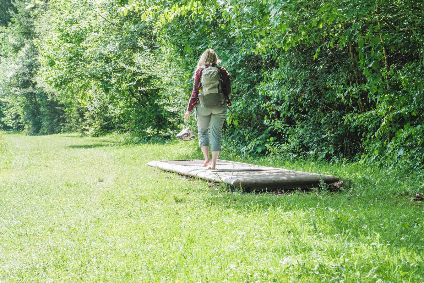 Der idyllische Reiner Barfußweg führt entlang vom Mühlbach und vorbei an mehreren Mitmach-Stationen. Der barrierefreie Weg ist auch für Kinderwägen gut geeignet.