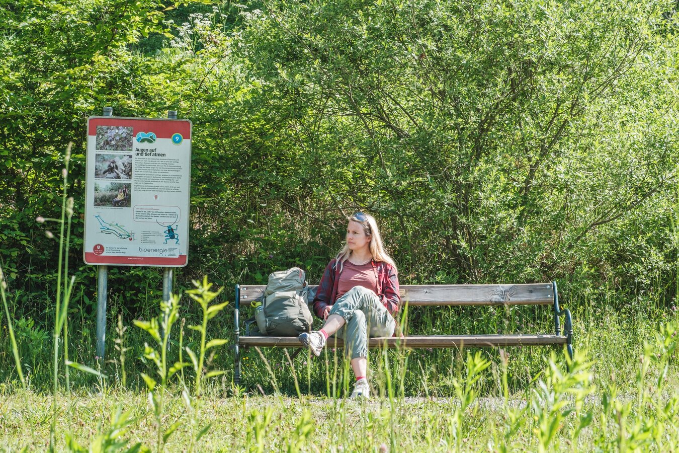 An den Rastplätzen kann man verweilen und die idyllische Umgebung aus Wiesen und Wäldern genießen.