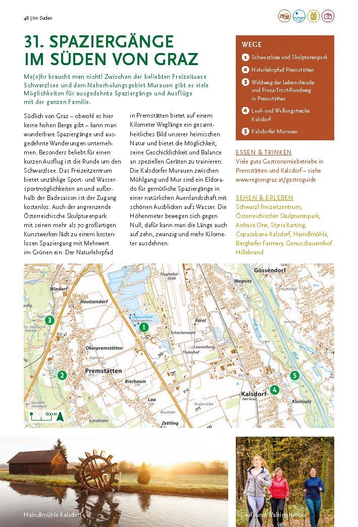 Südlich der Landeshauptstadt Graz erstrecken sich sanfte Hügel, wie der Buchkogel, Gedersberg oder Florianiberg, die ideale Orte zum Entspannen bieten. Von den Aussichtsplattformen eröffnen sich atemberaubende Panoramen. Auch entlang der Mur, bei einem Spaziergang durch die Murauen, kann man wunderbar dem städtischen Trubel entfliehen, die Natur genießen und zur Ruhe kommen.
