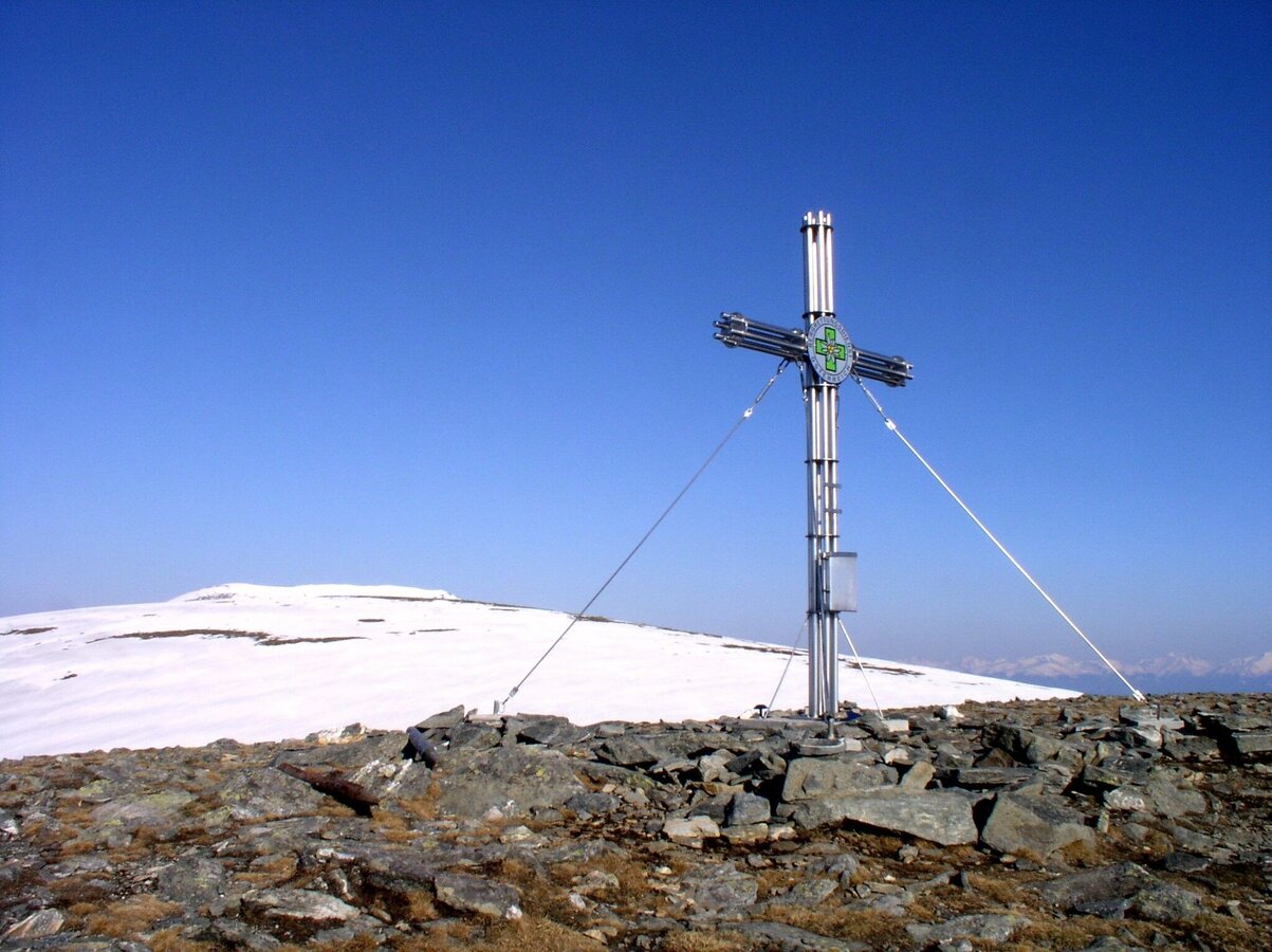 Wir folgen den Markierungsstangen und kommen so zum höchsten Punkt des Speikkogels auf der Stubalm. Dieser 1.993m hohe Punkt ist NICHT mit dem Gipfelkreuz sondern nur mit einer Markierungsstange gekennzeichnet.
