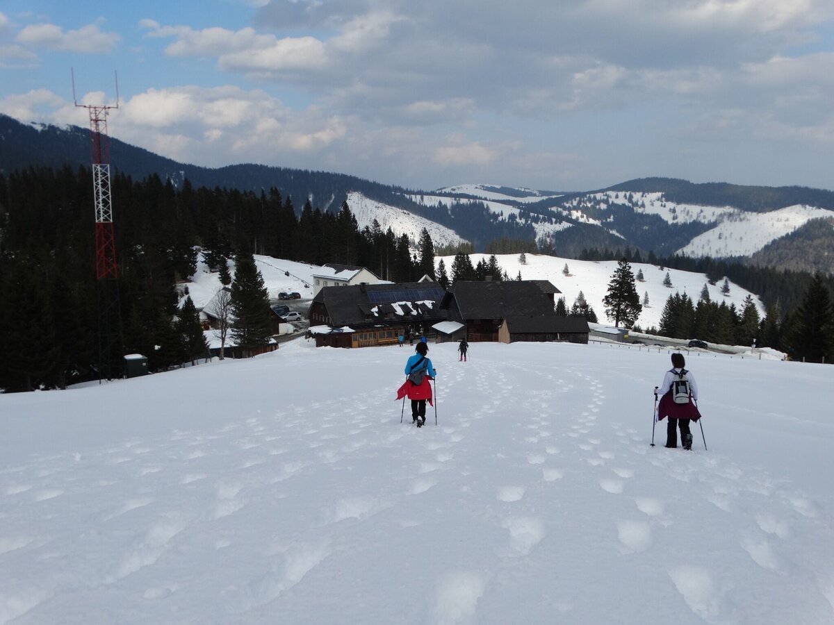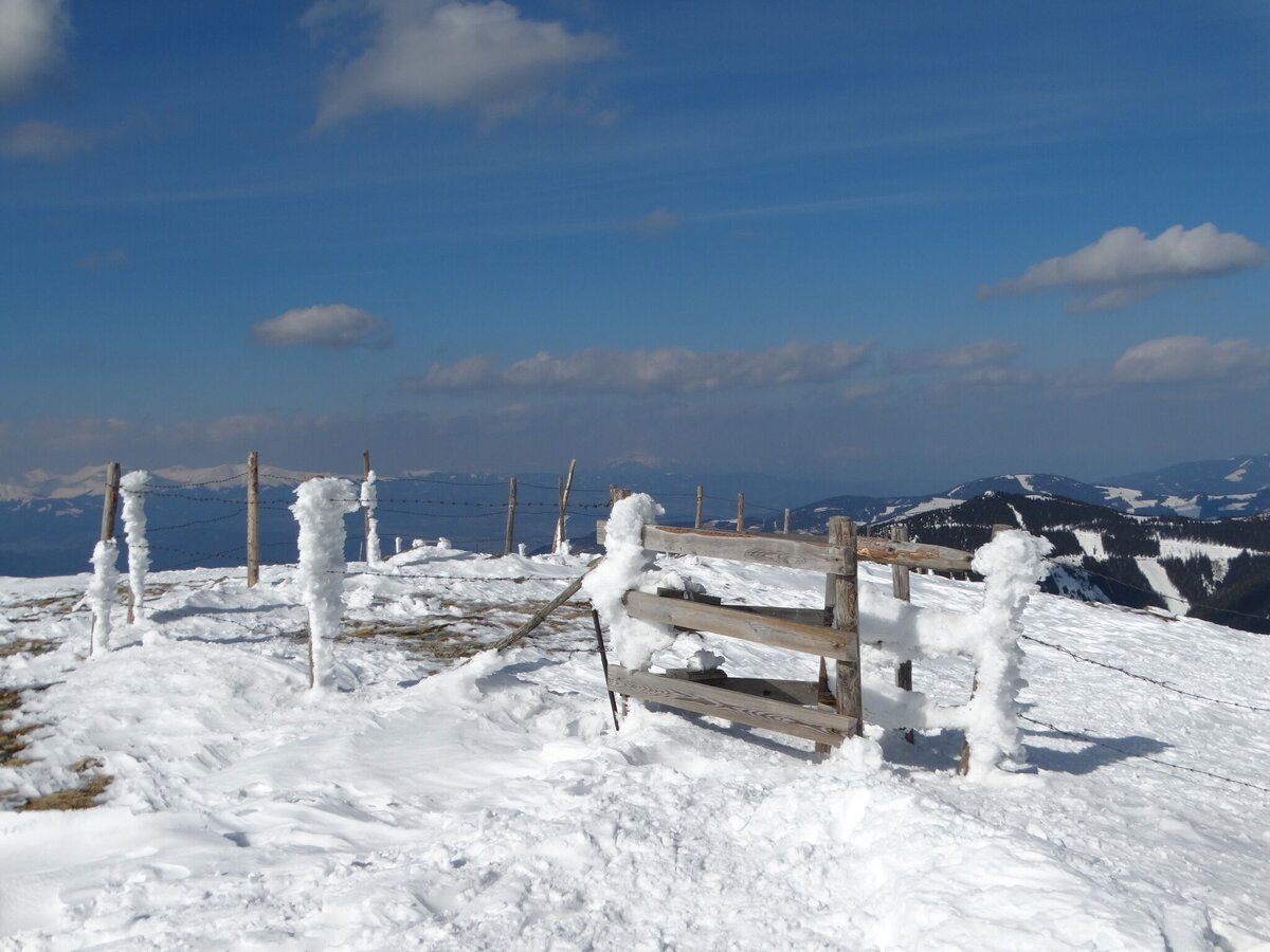 Zurück nehmen wir den gleichen Weg, machen dann aber einen kurzen Umweg über das Gipfelkreuz, das auf 1.979m Seehöhe steht. Bei einer weiteren Markierungsstange verlassen wir den Wanderweg und halten uns links. Nun haben wir die einzigartige Möglichkeiten Spuren in den Schnee zu ziehen. Wir gehen etwas unterhalb der Windräder parallel zu einem kleinen Graben weiter, bis wir eine Forststraße erreichen, wir halten uns rechts und kommen nach einiger Zeit wieder auf den Weitwanderweg 505, der uns geradewegs zum Parkplatz des Salzstieglhauses bringt.
