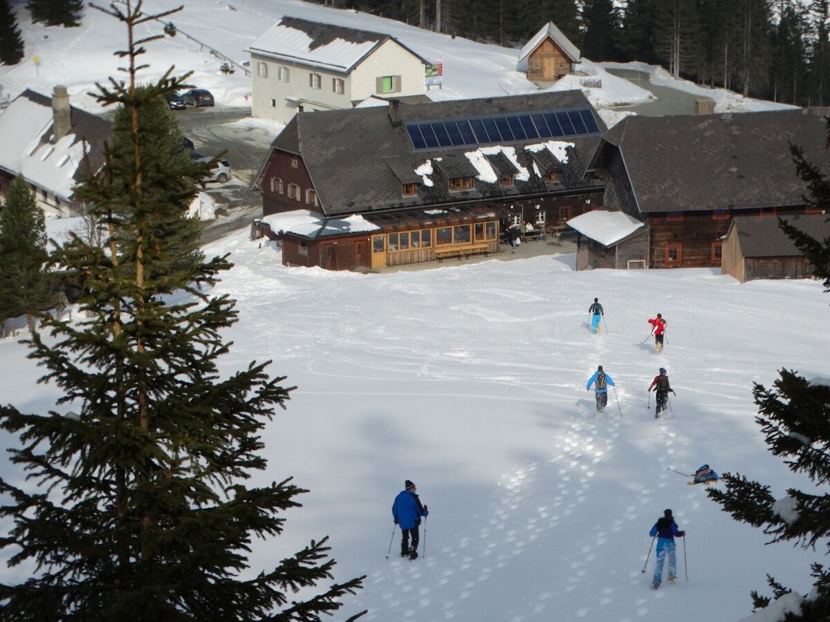 Wir starten beim Parkplatz des Salzstieglhauses auf 1.553m und folgen der Markierung des Weitwanderweges 505. Dieser Weg verläuft zuerst auf einer Schipiste, aber nach kurzer Zeit zweigen wir rechts in den Wald ab. Nach einer kurzen Steigung wird es wieder flacher.