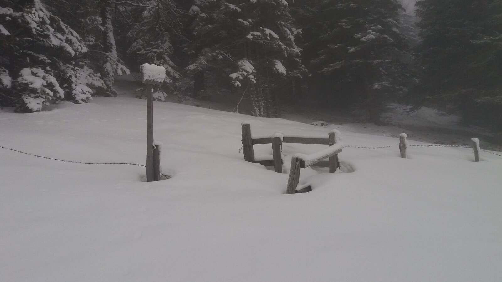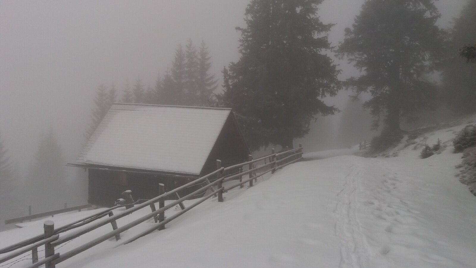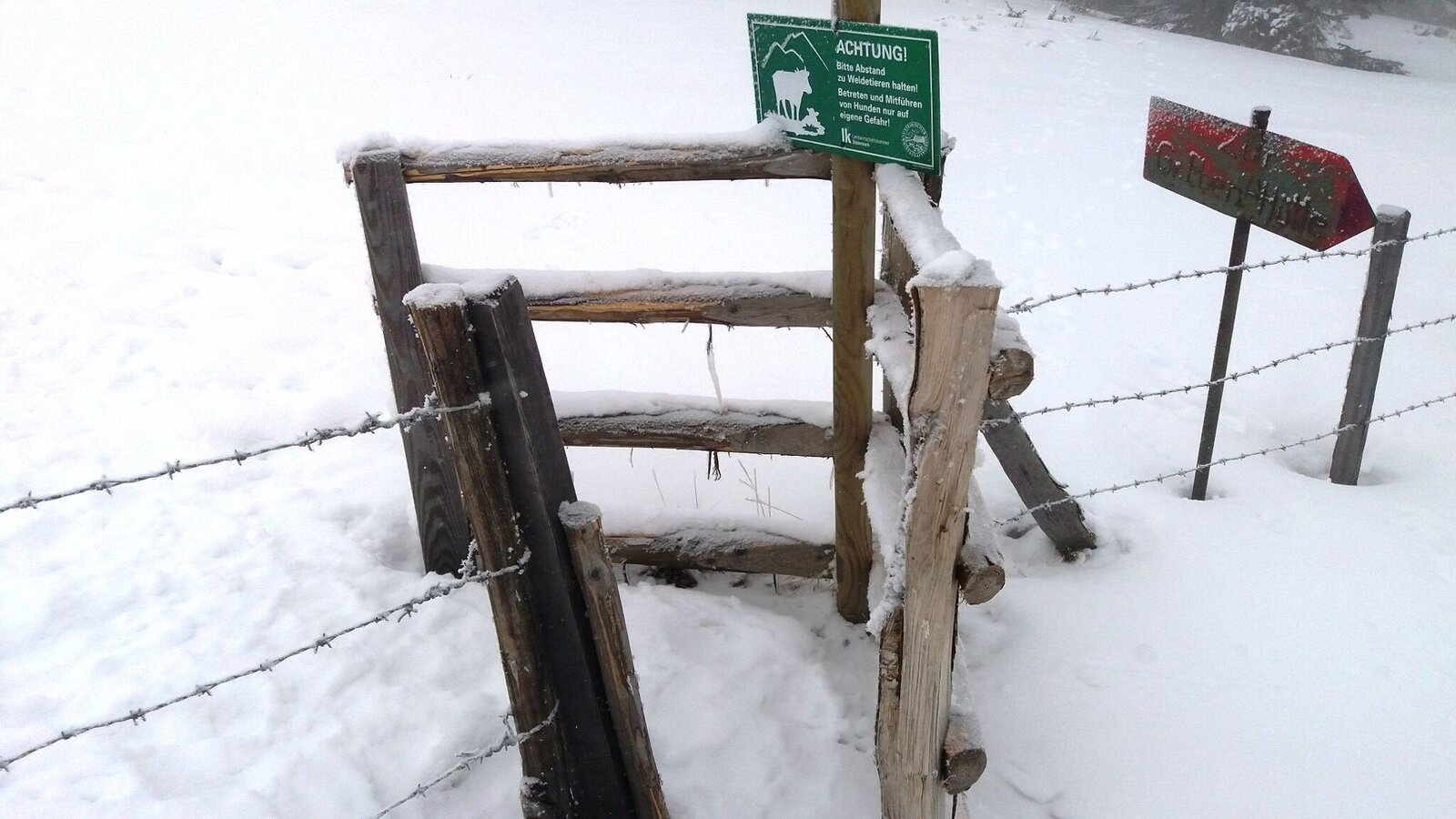 Wir können den gleichen Weg zurückgehen, wer aber einen Rundweg – ACHTUNG: Bei Nebelwetter ist diese Variante nicht zu empfehlen!!! – machen will, geht an der Hütte vorbei und biegt gleich nach der Holzgarage links ab. Wir stapfen über eine verschneite Wiese, zwischen ein paar großen Bäumen durch und müssen einen kleinen Holzsteg überqueren. Wir erreichen eine kleine Anhöhe, von hier aus geht es ca. 400 quer über die Almweide bis zum Waldrand. Wir durchqueren einen kurzes Waldstück, kommen zu einem Wanderer-Durchlass und marschieren munter weiter, bis wir zu einem Holzzaun mit einem Häuschen (= Futterstelle im Sommer) kommen. Wir wandern noch ein kurzes Stück und biegen dann halb rechts auf den Wölkertkogel ab, wo die Steinerne Miarz auf uns wartet.