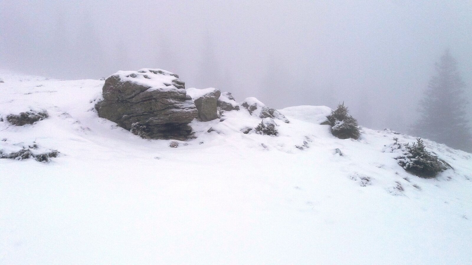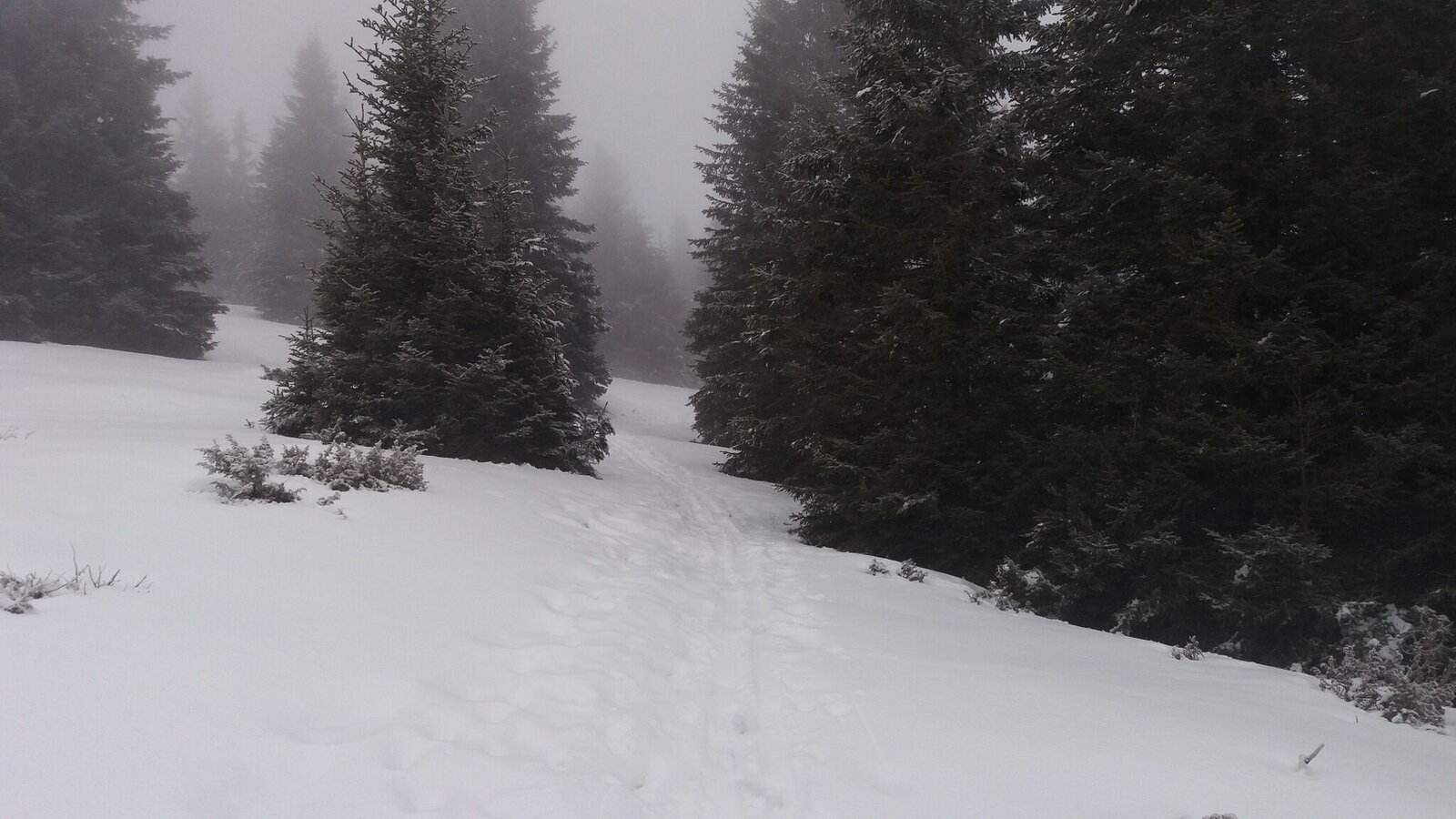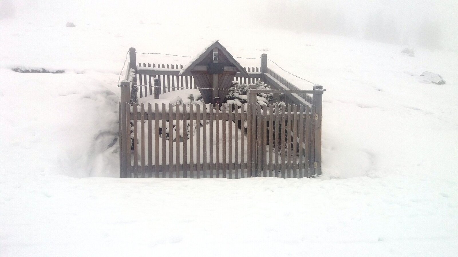 Wir können den gleichen Weg zurückgehen, wer aber einen Rundweg – ACHTUNG: Bei Nebelwetter ist diese Variante nicht zu empfehlen!!! – machen will, geht an der Hütte vorbei und biegt gleich nach der Holzgarage links ab. Wir stapfen über eine verschneite Wiese, zwischen ein paar großen Bäumen durch und müssen einen kleinen Holzsteg überqueren. Wir erreichen eine kleine Anhöhe, von hier aus geht es ca. 400 quer über die Almweide bis zum Waldrand. Wir durchqueren einen kurzes Waldstück, kommen zu einem Wanderer-Durchlass und marschieren munter weiter, bis wir zu einem Holzzaun mit einem Häuschen (= Futterstelle im Sommer) kommen. Wir wandern noch ein kurzes Stück und biegen dann halb rechts auf den Wölkertkogel ab, wo die Steinerne Miarz auf uns wartet.
