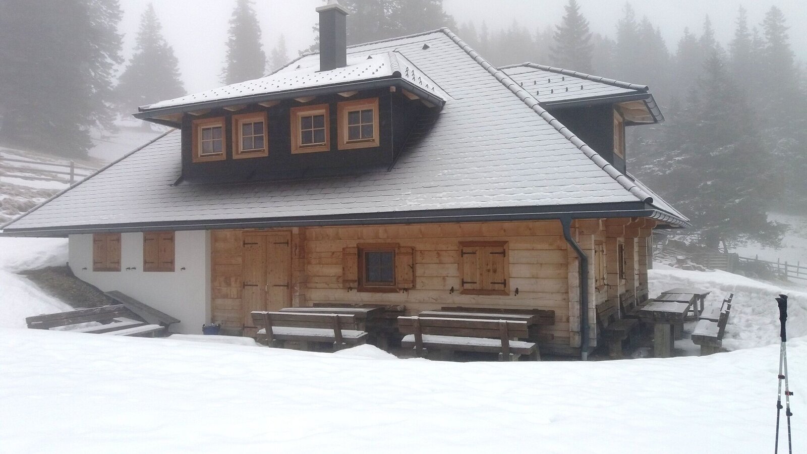 Auch hier steigt der Wegverlauf ein wenig an, aber nach rund 500 m erreichen wir die „alte“ und die „neue“ Großebenhütte (Achtung: diese Hütten sind im Winter nicht bewirtschaftet). Hier können wir kurz Rast machen, den Ausblick auf die Hirschegger Alm mit ihren Gipfeln genießen, bevor wir uns auf den Rückweg zum Alten Almhaus machen.