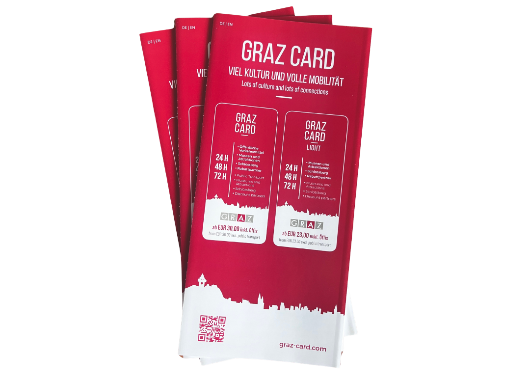 Die Graz Card ermöglicht 24, 48 oder 72 Stunden freie Fahrt mit öffentlichen Verkehrsmitteln sowie freien Eintritt zu zahlreichen Attraktionen in Graz. Zudem profitieren Sie von Ermäßigungen bei Sehenswürdigkeiten und Museen. Die Graz Card Light richtet sich an Personen mit eigenem Ticket für öffentliche Verkehrsmittel und bietet freien oder ermäßigten Eintritt zu wichtigen Sehenswürdigkeiten und Museen sowie weitere Vergünstigungen – ideal für Entdecker, die die Stadt Graz erleben und entdecken möchten.