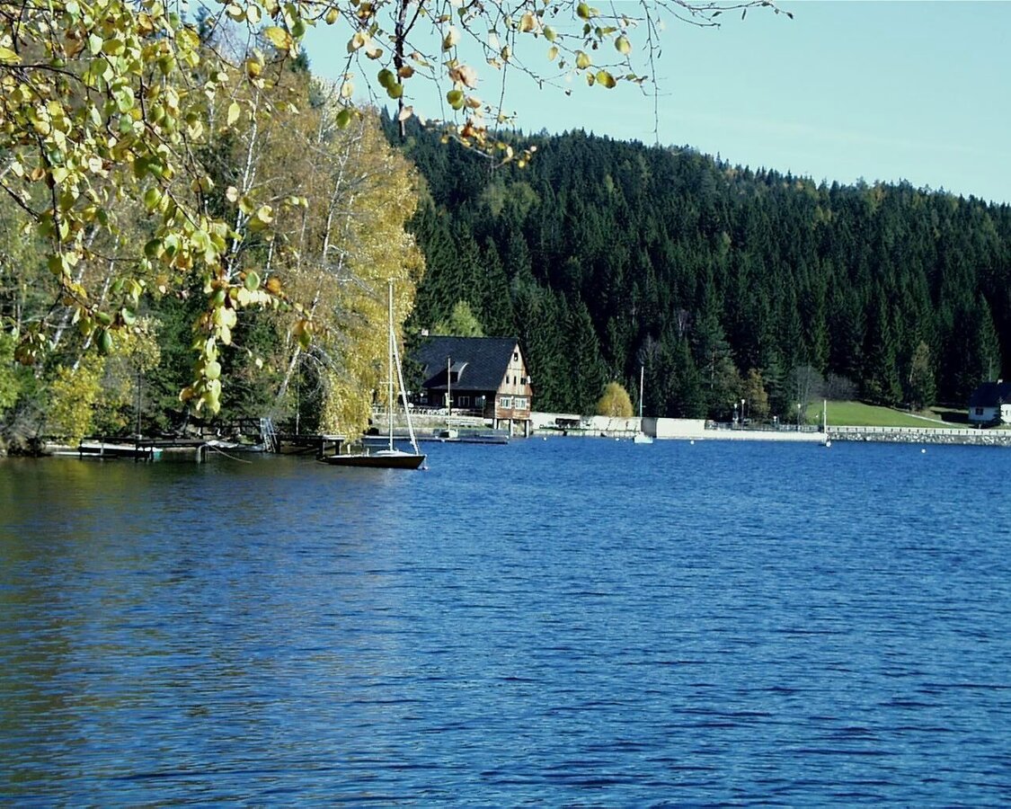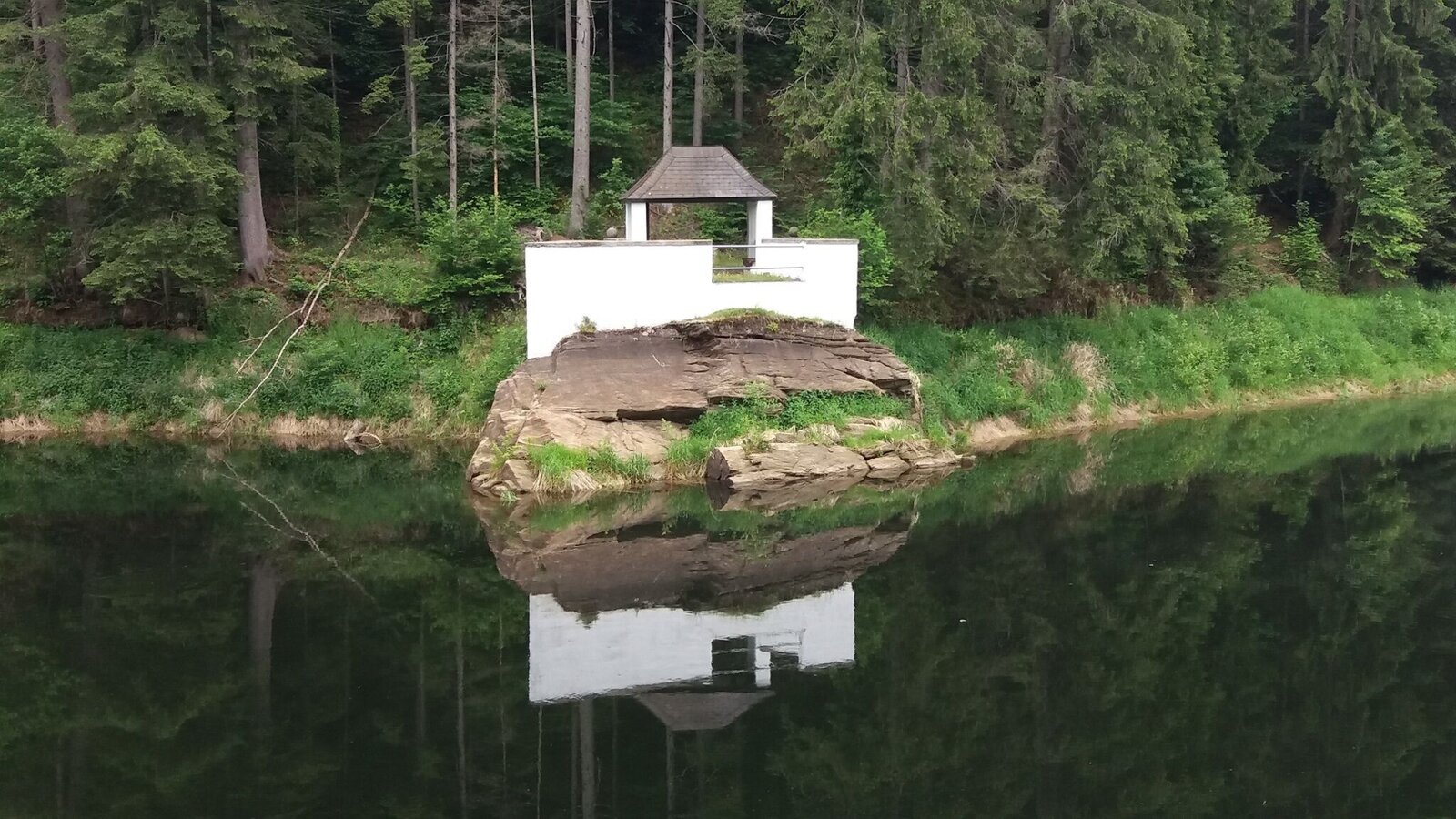 Vom Blochwirt bis zum Hahnenschloss sind wir ca. 40 Minuten unterwegs. Rund 700 m nach dem Hahnenschloss führt der Weg 569 links in Richtung Hirzmann Stausee, die nach einer weiteren Stunde erreicht ist. Hier kommen wir an der „Ströhbernen Brücke“ vorbei, die erstmals 1687 erwähnt wurde und ihren Namen wegen ihres Stroh gedeckten Daches hat. Einer Privatinitiative ist es zu verdanken, dass sie vor einigen Jahren restauriert wurde.