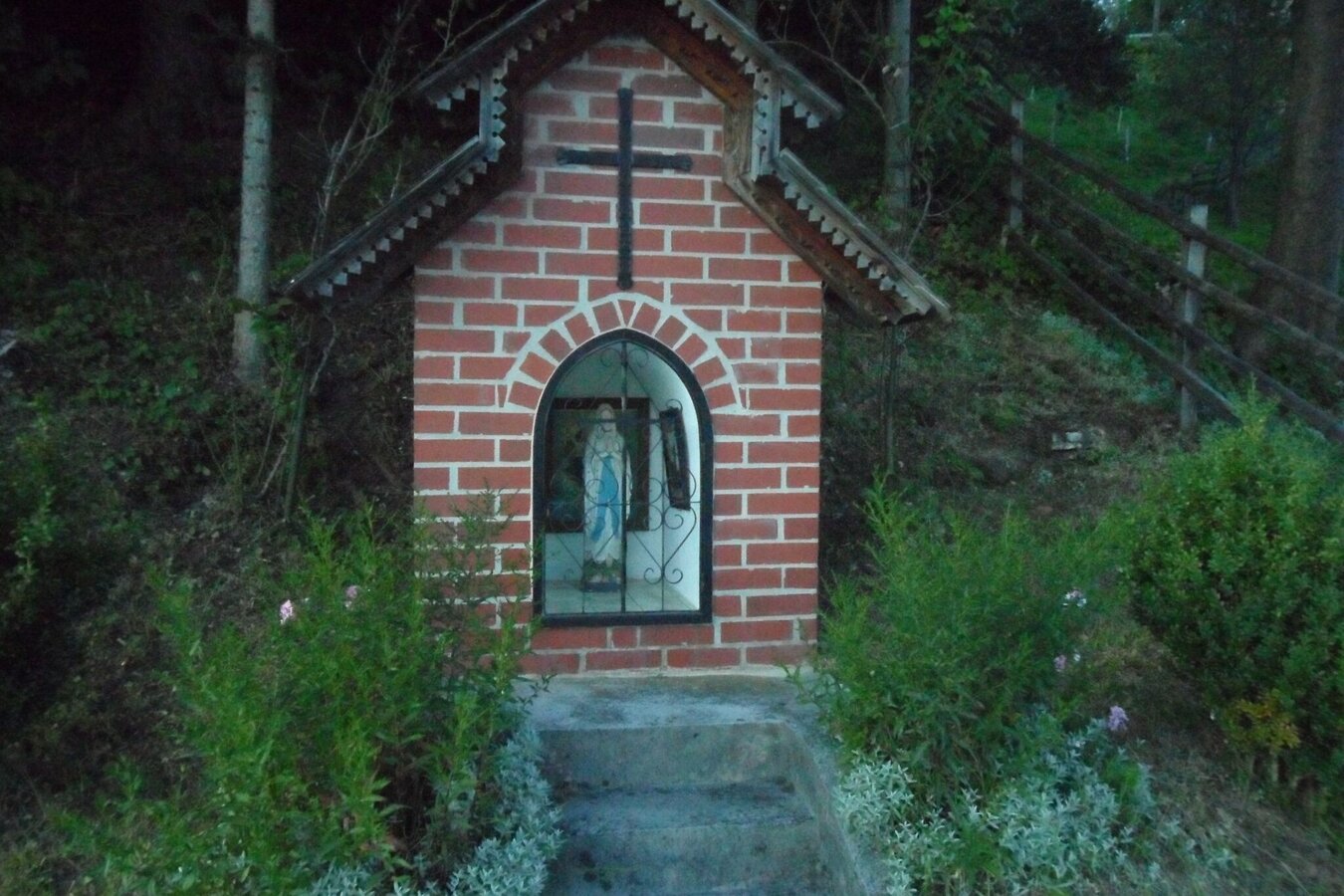 Wir spazieren durch den Wald weiter, kommen zu einer Wiese, wo wir auch einen Bauernhof sehen. Wir gehen hinter wem Wohnhaus vorbei und kommen erneut in ein Waldstück. Dieses Waldstück zeichnet sich wieder durch Dickicht und Wildwuchs aus, der das Ergebnis des Windwurfes 2008 ist. Wir erreichen wieder die Asphaltstraße – auf unserer linken Seite sehen wir ein schlichtes Straßenkreuz. Wir gehen links bergab weiter, kommen zu einer schönen Kapelle und gehen geradeaus weiter (ACHTUNG: Hier fehlt die Tafel mit dem Wegweiser) beim Hof vulgo Veitbauer vorbei.