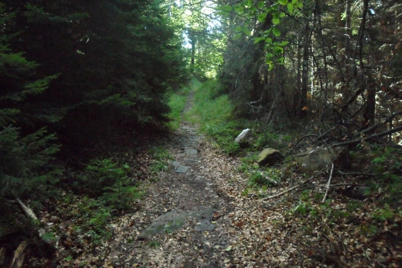 Nach kurzer Zeit biegen wir wieder rechts der Markierung folgend in den Wald ein, gehen über eine Lichtung und kommen wieder auf einen von Wald umgebenden Wanderweg. Wir kommen gut voran, da der Weg hier relativ flach verläuft.