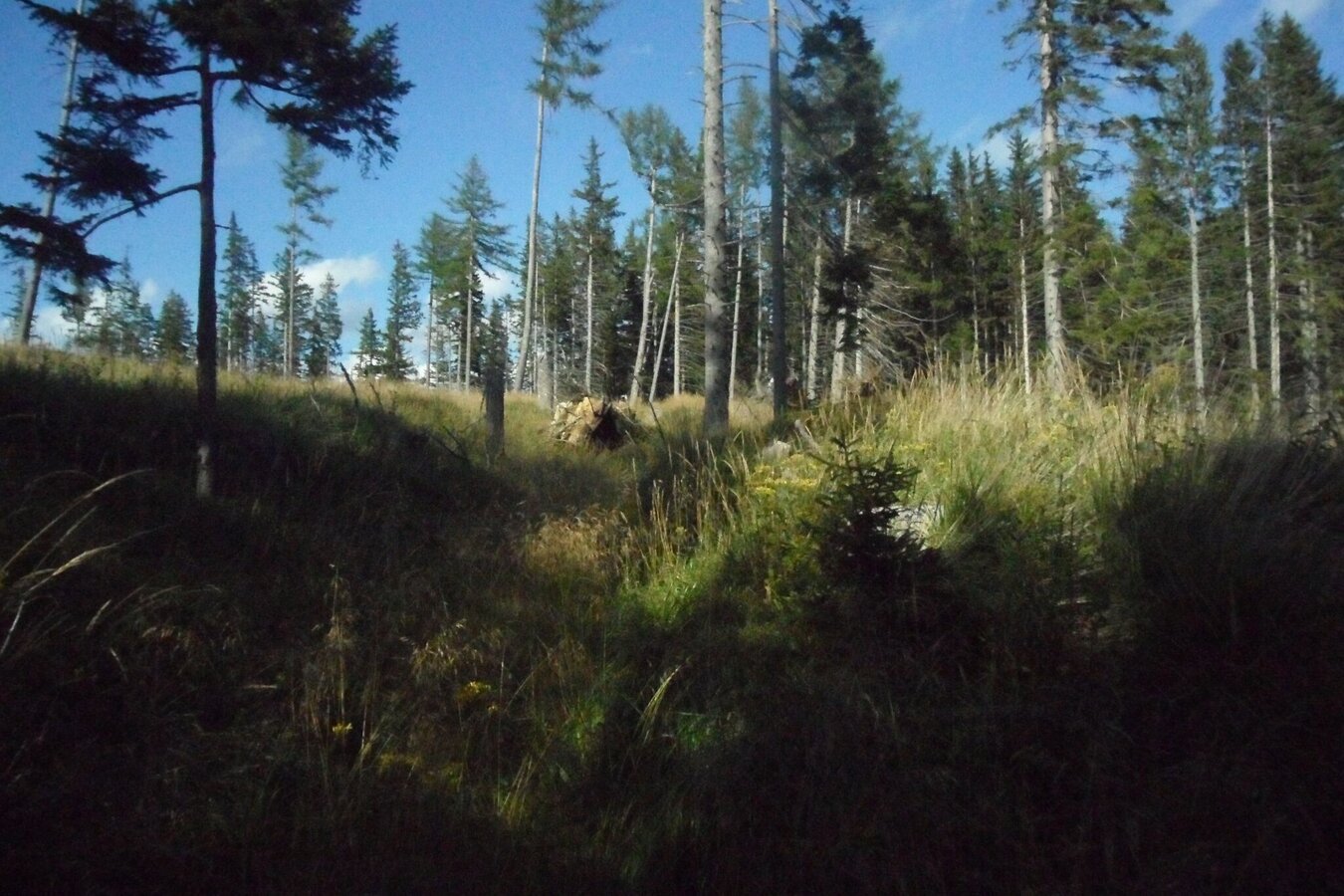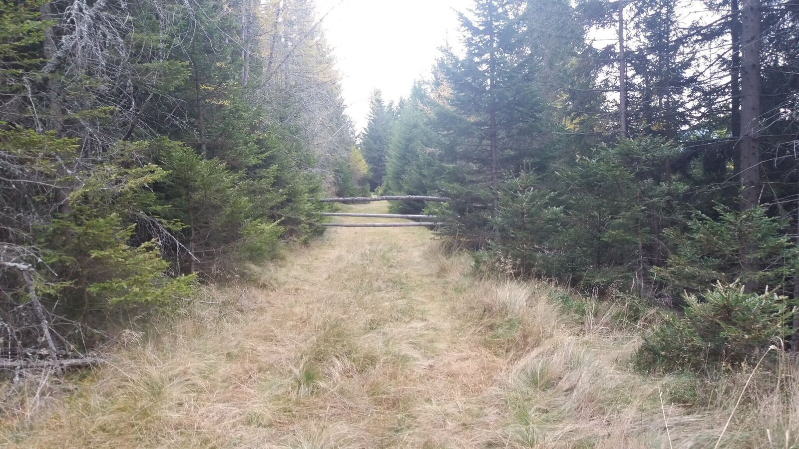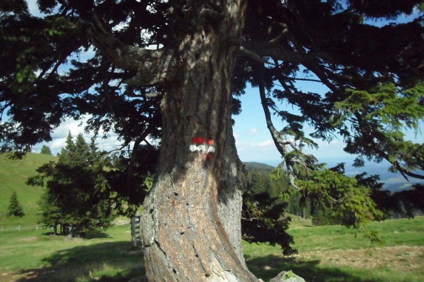 Nach fast 4 km vom Alten Almhaus entfernt erreichen wir wieder die Wanderweg-Kreuzung 51 und 546. Hier halten wir uns nun rechts und folgen nun de Wanderweg mit der Nr. 546. Der Weg bringt uns rasch voran, zwischendurch müssen wir immer wieder über kleinere Bäume steigen, die hier immer wieder des Opfers starken Windes werden. Wir erreichen nach rund 1 km nach der Abzweigung eine Lichtung. Hier gehen wir entlang des „Sommerlagen Zaunes“ weiter, genießen einen herrlichen Ausblick auf der rechten Seite auf die Hirschegger-Alm und die darauffolgende Koralm – wir sehen hier die „Goldhauben“, die Radarstation des Bundesheeres.