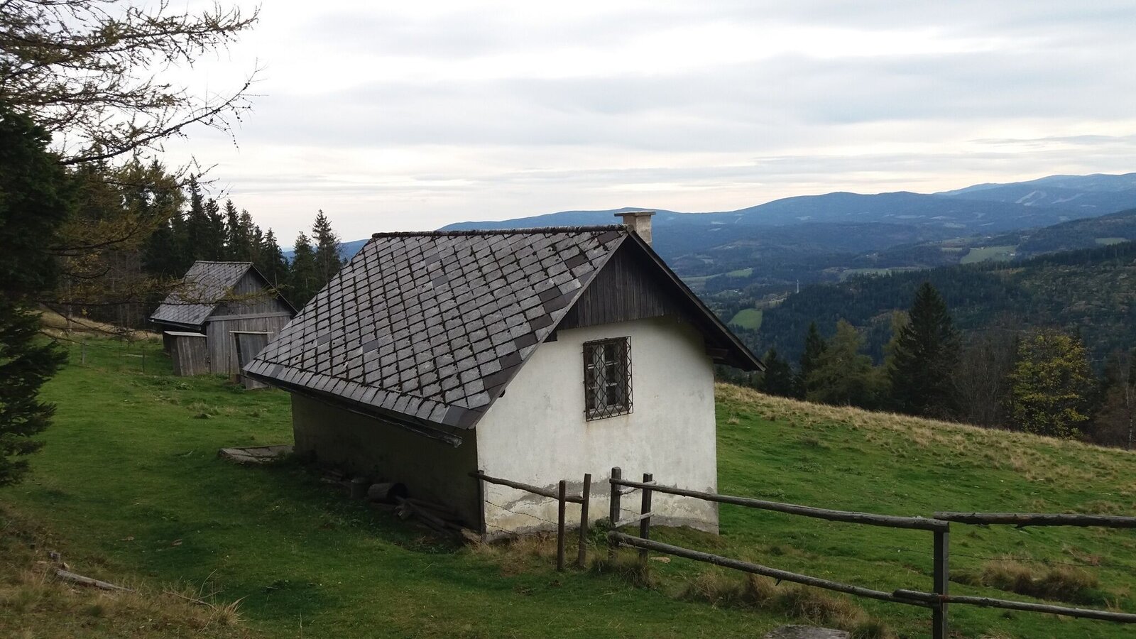 Wir gehen der Markierung folgend weiter stetig bergauf, wir folgend dem Waldrand und erreichen nach einem etwas beschwerlicherem Stück eine Schotterstraße. Nun ist es nicht mehr weit bis zu unserem Ziel. Wir biegen rechts ab, bleiben ein Stück auf der Schotterstraße und sehen links über uns bereits das Alte Almhaus.