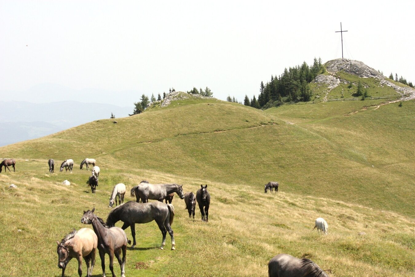 Für den Rückweg nehmen wir für rund 1,8 km den gleichen Weg, den wir schon vom Aufstieg kennen. Das heißt wir gehen wieder die Schotterstraße zurück, biegen dann links in den Wald ab und gehen am Waldrand entlang, begleitet von den Sommerweiden der Lipizzaner-Junghengste munter weiter. Wir kommen beim Soldatenhaus vorbei, gehen ein kurzes Stück im Wald und erreichen dann die asphaltierte Straße, auf der wir für 500 m bleiben.
