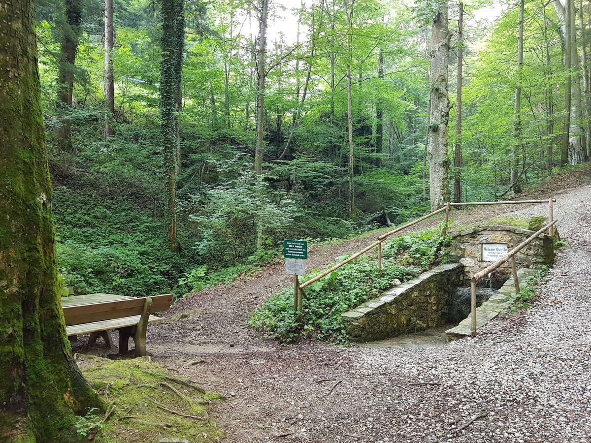 Auf dem gleichen Weg geht es retour zur Katharina Quelle und dann weiter bergab zur Räuber und der Emilien Quelle bis man zur Gemeindestraße gelangt. Hier hält man sich links, vorbei an der Roschker Quelle und gelangt zum Kalvarienberg St. Radegund mit seiner Eremiten und Kalvarienberg Quelle. Anschließend geht es retour zum Ausgangspunkt der Tour, dem Curcafe St. Radegund.