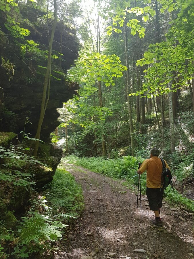 Weiter geht es vorbei am Hohenwartstein und bergauf zur Melanie Quelle. In weiterer Folge hält man sich auf dem Waldweg bzw. dem Gemeindeweg bis man zur Burgruine Ehrenfels gelangt. Dort geht es dann nach einem kurzen Abstieg wieder bergauf zur Katharina Quelle und weiter zum Novystein mit seiner schönen Aussicht.