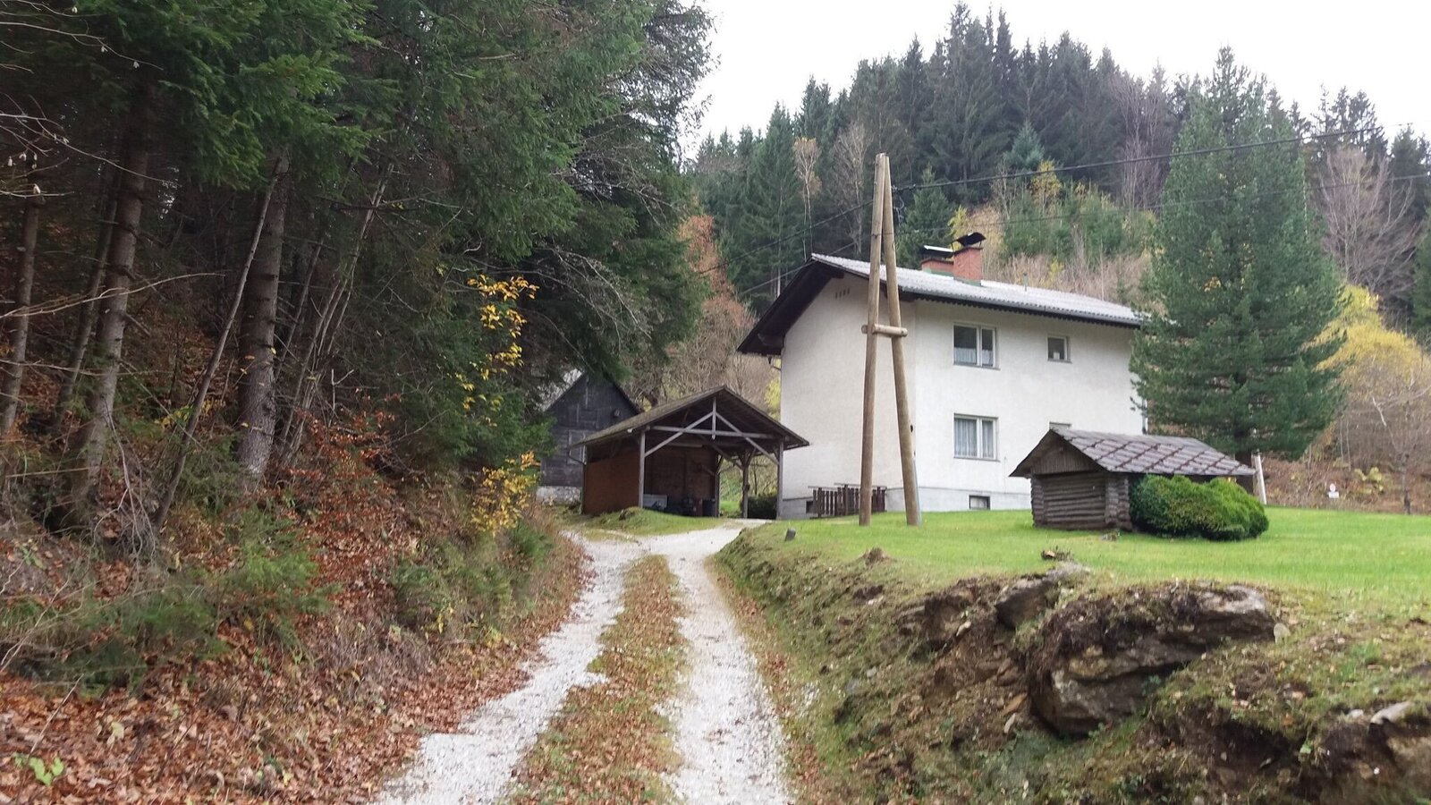 Wir gehen der Markierung folgend weiter stetig bergauf, wir folgend dem Waldrand und erreichen nach einem etwas beschwerlicherem Stück eine Schotterstraße. Nun ist es nicht mehr weit bis zu unserem Ziel. Wir biegen rechts ab, bleiben ein Stück auf der Schotterstraße und sehen links über uns bereits das Alte Almhaus.