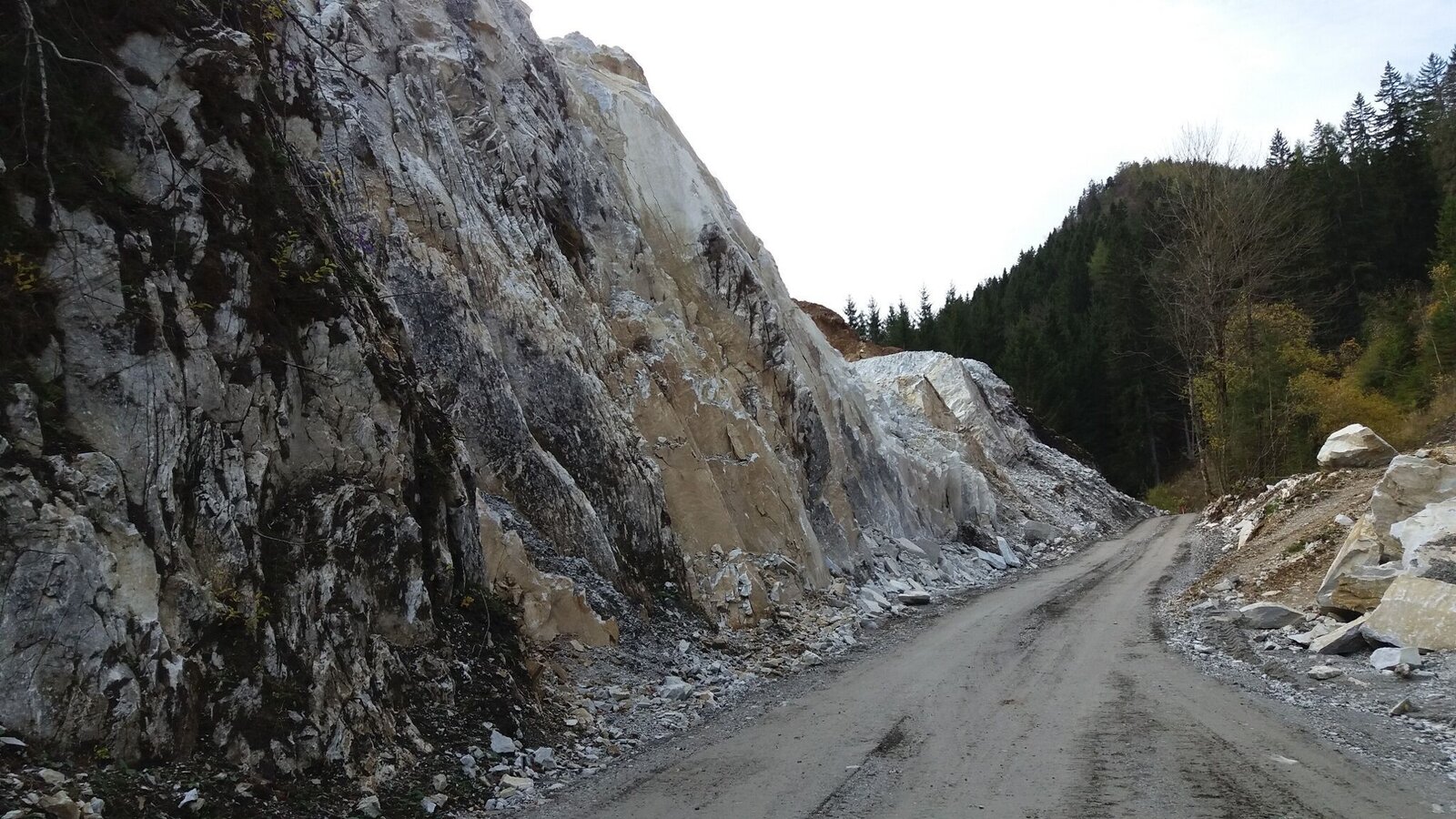 Wir wandern links beim Wohnhaus vorbei, kommen zu einem Steinbruch und gehen weiterhin geradeaus. Die imposanten Gesteinsformationen des Sallegger Marmors beeindrucken uns, bevor wir diese hinter uns lassen. Eine Holztafel am Ende des Steinbruches informiert uns kurz über den Marmor, der hier abgebaut wird.