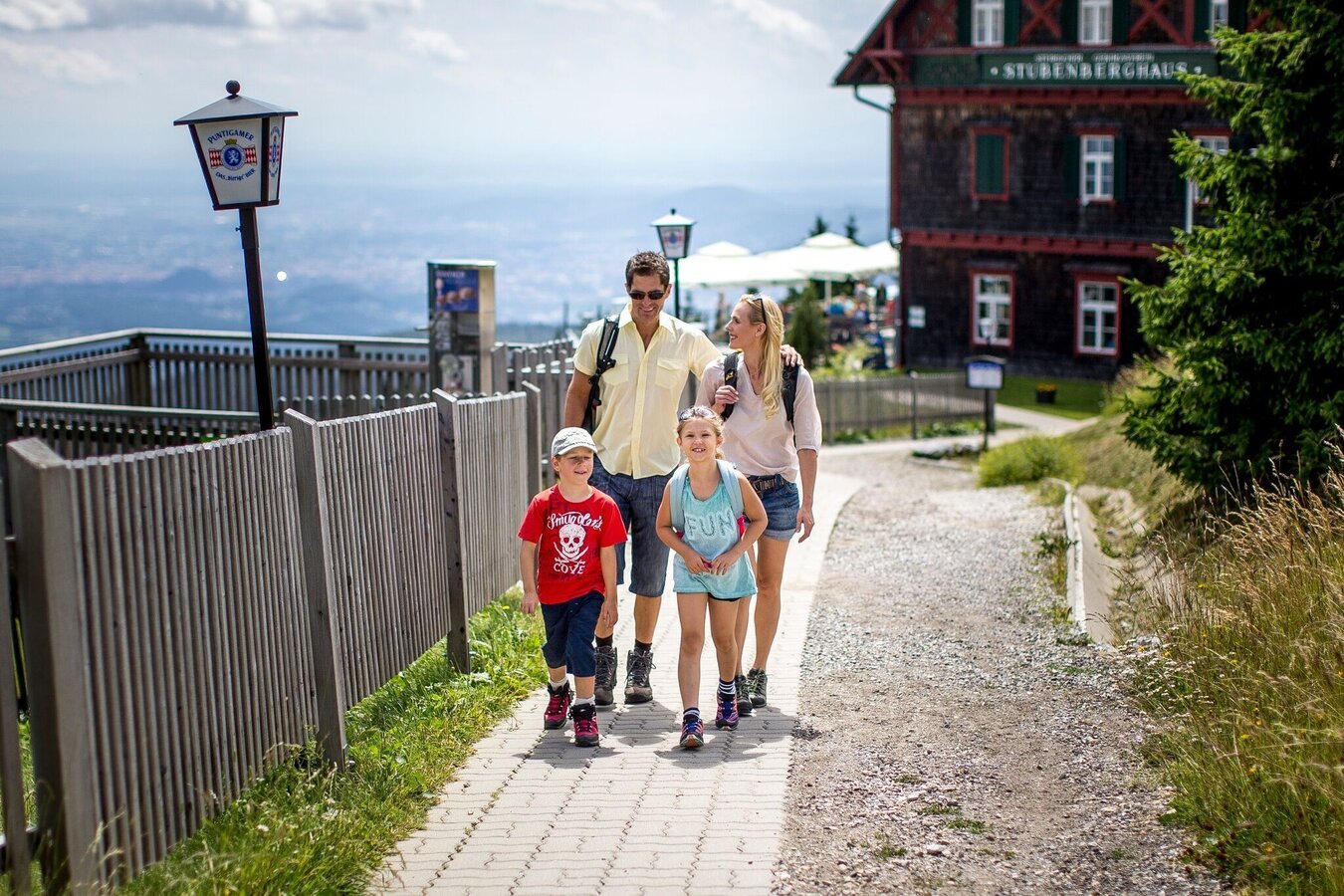 Ab St. Radegund führt der sogenannte Normalwanderweg Nr. 21 oder auch 06 Mariazellerweg bzw. GUW direkt von der Talstation rechts der Straße durch den Wald bergauf bis zur Schöcklstraße, dieser einige Meter entlang und dann über die Straße, vorbei am Schranken auf den markierten Wanderweg. Diesem folgen wir nun, unter der Seilbahn durch und immer bergauf Richtung Stubenberghaus. Der Weg quert die Mautstrasse und biegt dann nach rechts und kommt direkt unter der Seilbahn bei der Halterhütte aus dem Wald. Ab hier gibt es mehrer Möglichkeiten, entweder links bergauf zur Sommerrodelbahn und direkt zum Alpengasthof und Stubenberghaus (Bergstation Seilbahn) oder rechts weiter direkt zum Ostgipfel oder auch links von der Halterhütte Richtung Westgipfel.