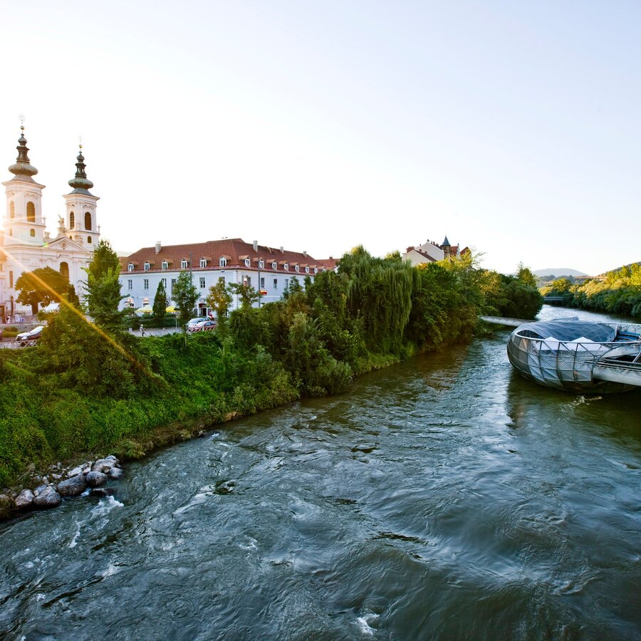 Direkt im Fluss erblicken Sie die Murinsel, die anlässlich der Kulturhauptstadt 2003 errichtet wurde. Sie ist über zwei Stege mit beiden Murufern verbunden.