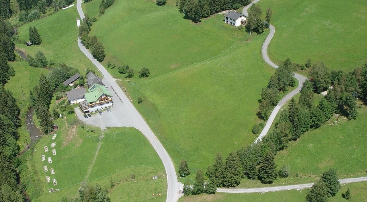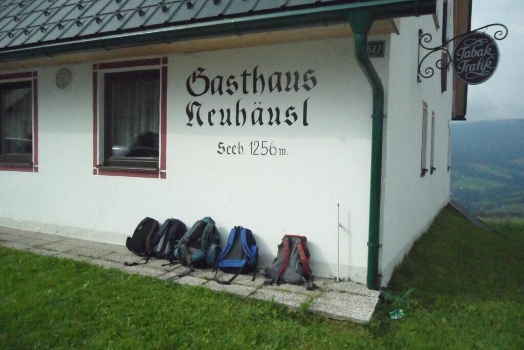 Am oberen Ende der Wiese mündet der Weg wieder in einen Waldweg, dem wir weiterhin folgen. Der Wegverlauf geht mäßig bergauf und wir bleiben nun im Wald, bis wir wieder zu einer befestigten Straße kommen. Hier halten wir uns rechts Richtung Gasthaus Neuhäusl (1.189m), wo unser erstes Zwischenziel liegt, und wir Einkehren können.